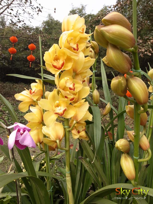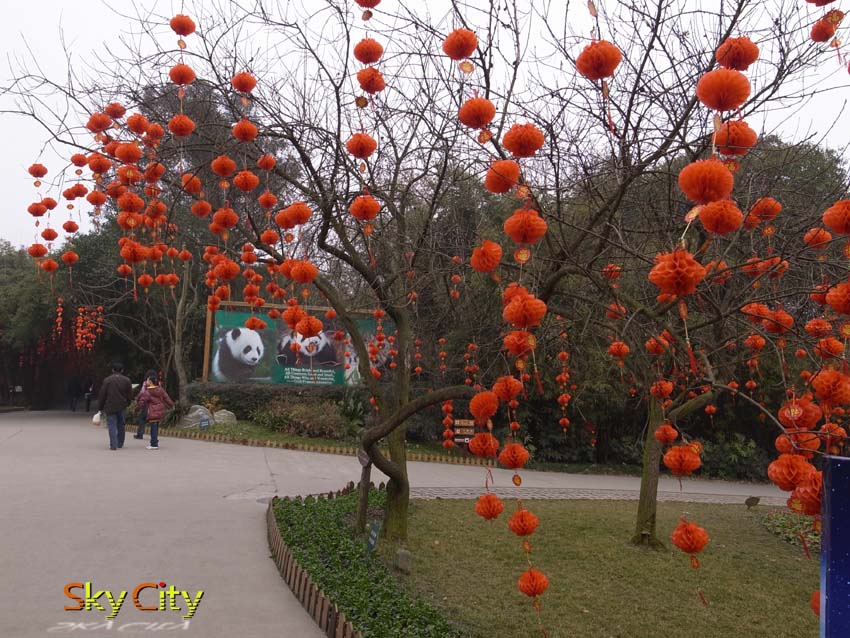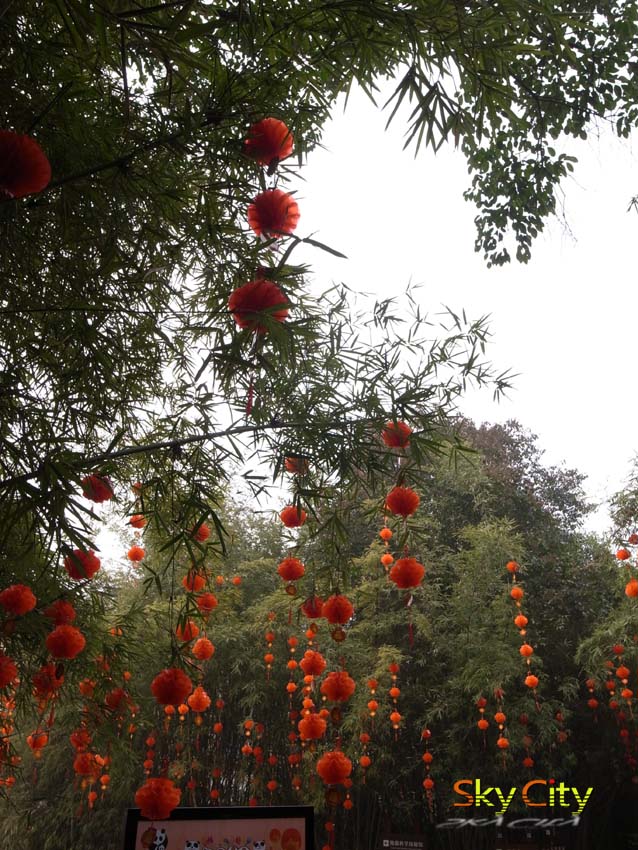 一进基地的大门,便感受到了浓浓的过年气氛,基地的大树 上挂满了红彤彤的灯笼,和仍旧绿意盎然的竹林,大树 形成了强烈的对比。