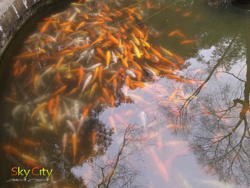 (熊猫别墅旁边的水池,慢慢的一池锦鲤,将池水染成了金黄色)