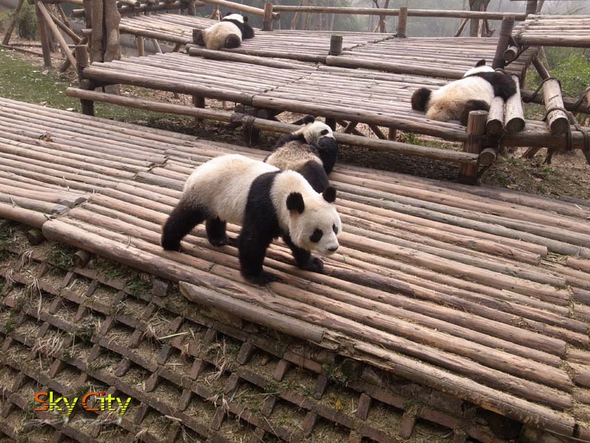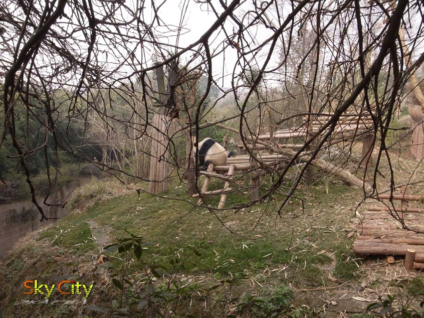 我们看到可爱的大熊猫时已经10点钟了,大部分熊猫都趴在或躺在木架上晒着太阳睡觉了,只有个别精力旺盛的熊猫还在懒散的吃着竹子,非常的可爱。