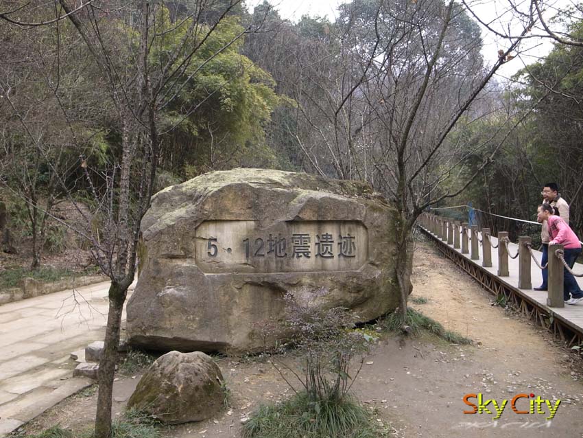 (道路上仍保留着5.12大地震时从山上滚落的大山石,被永远的留了下来)