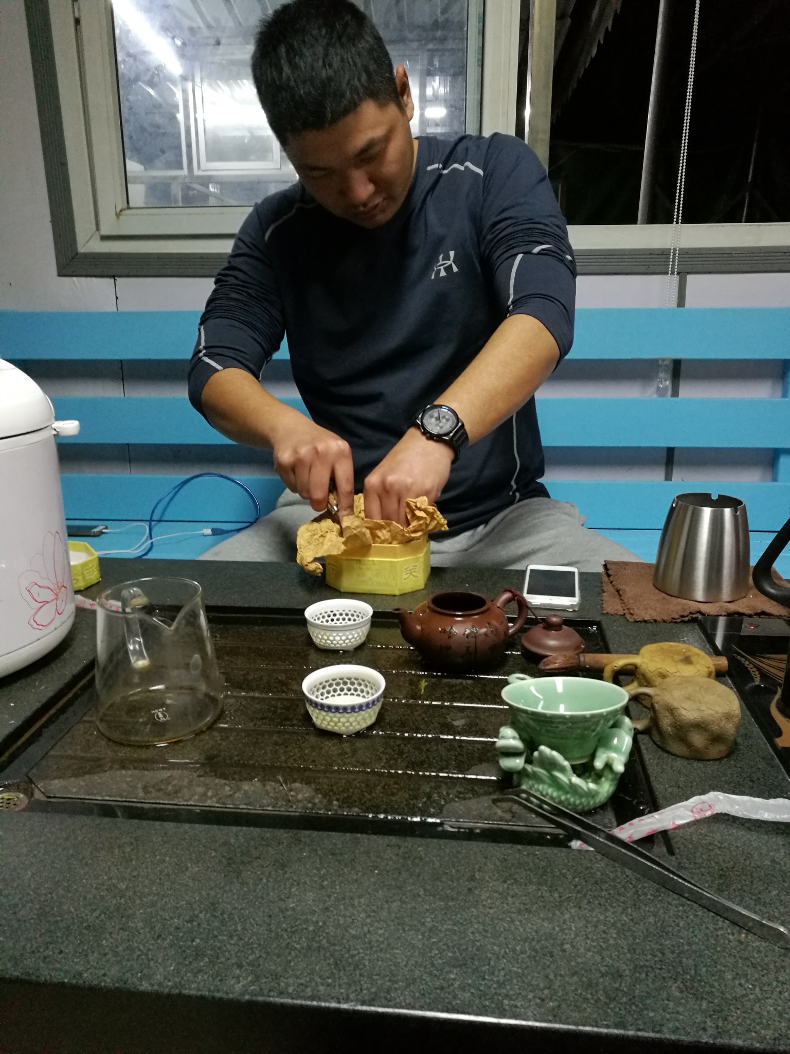 小哥挺能聊,也难怪,这里的夜晚太寂静了,晚上除了自己弄个烧烤没有其他娱乐,隔壁杂货店老板据说8点就早早上床了。又逢淡季时节,游客也不多。所以他倒也不见外地和我聊他家里的事儿。我见茶几上摆着些茶具,果真,如我所愿地,小哥开始沏上茶,弥补了之前没有汤的遗憾。