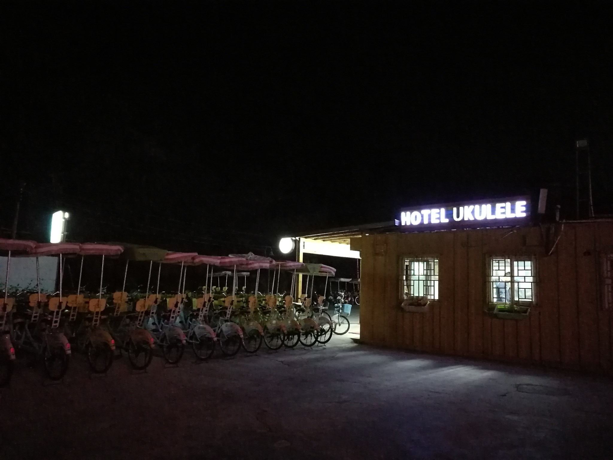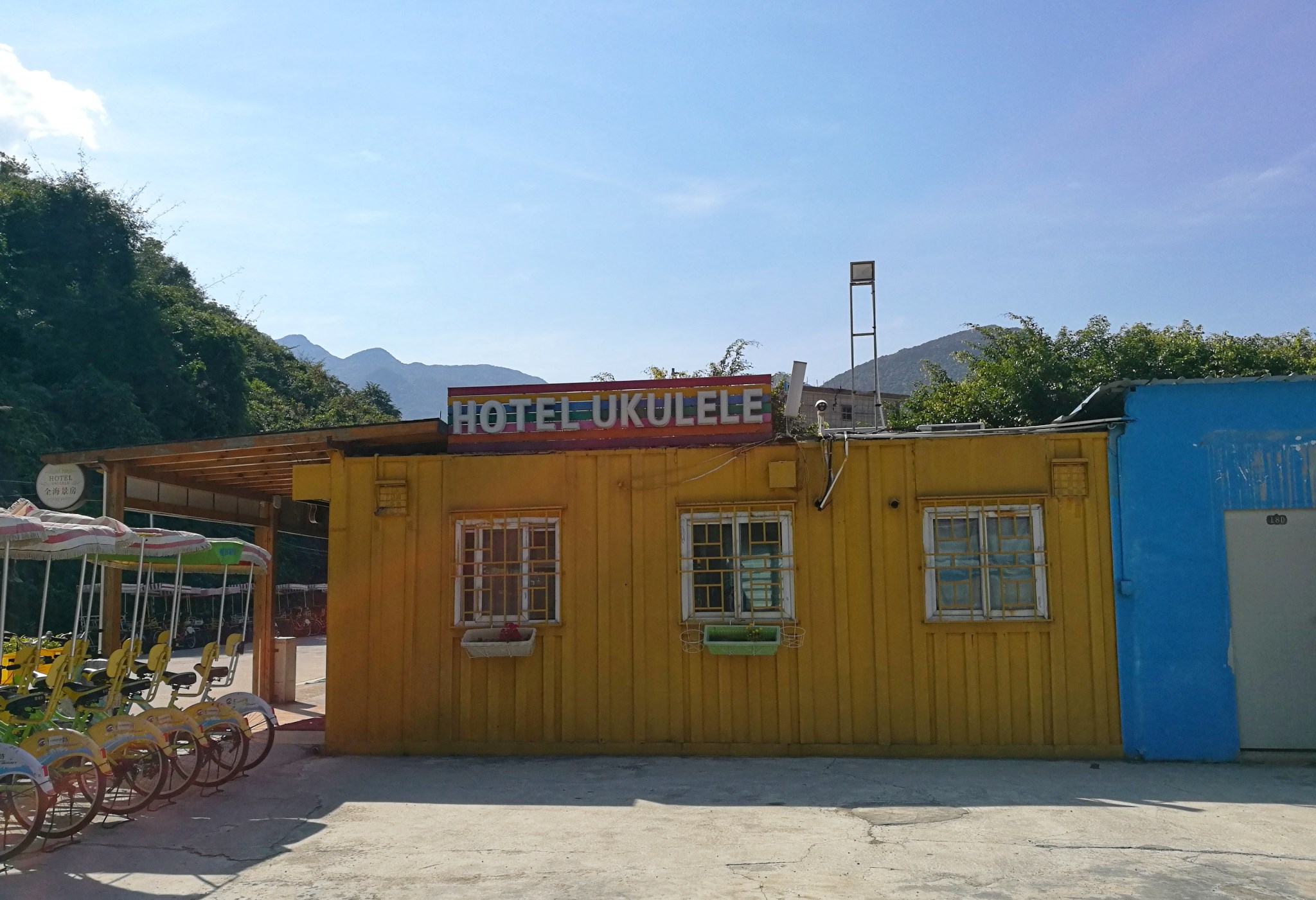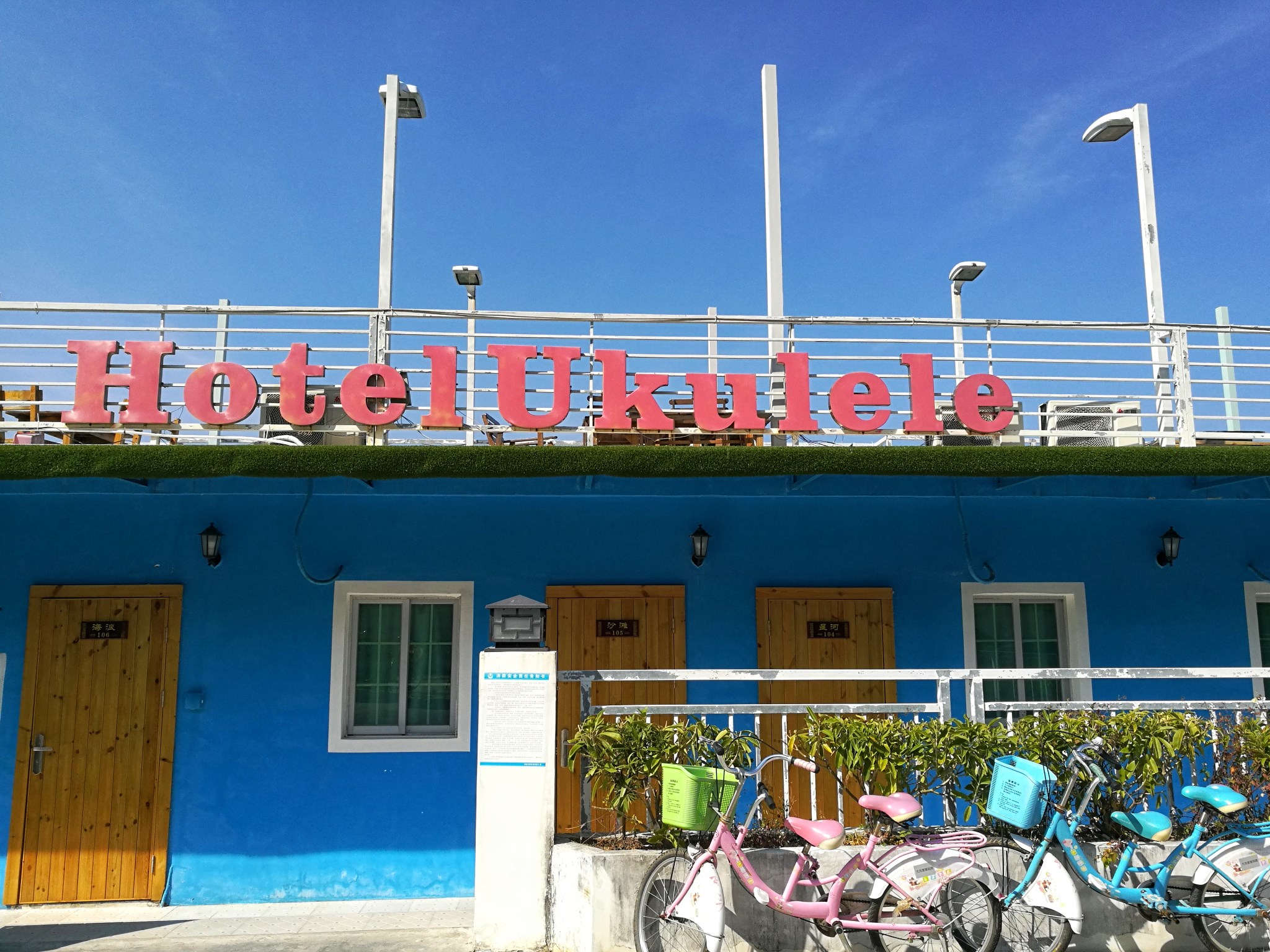 房间并不大,但东西一应俱全,蓝白色系,连提供的毛巾也是蓝色的。很切合主题的客栈前台墙上挂一溜的Ukulele外,房间里也有两把,我还忍不住拨弄了两下,可惜不会弹。