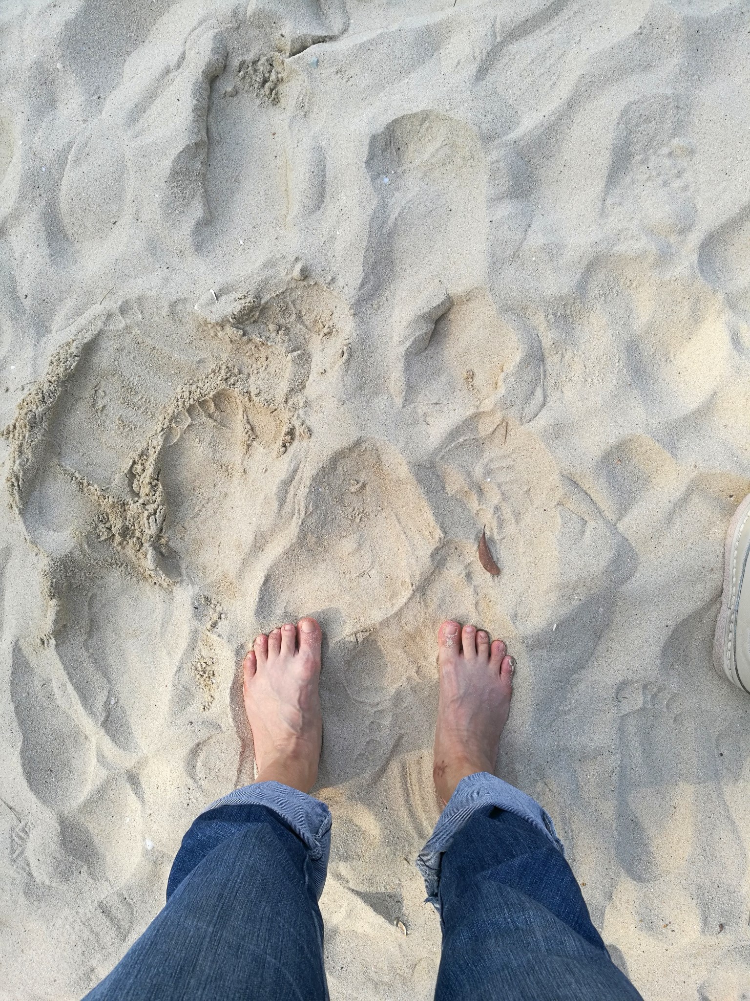 骑行的终点是鹿嘴山的景区入口,自行车必须寄存。往前走两步就是一片小沙滩,刚踏上沙滩没走几步,我就很自然地把鞋袜给脱了,仿佛赤脚才是对她的尊重。
