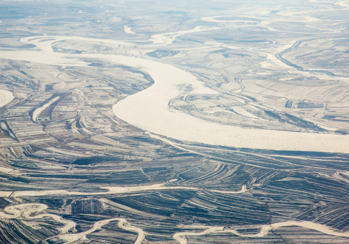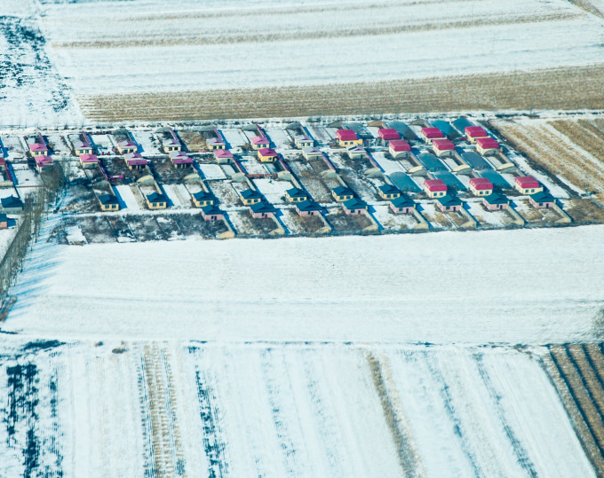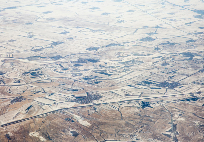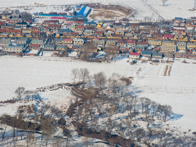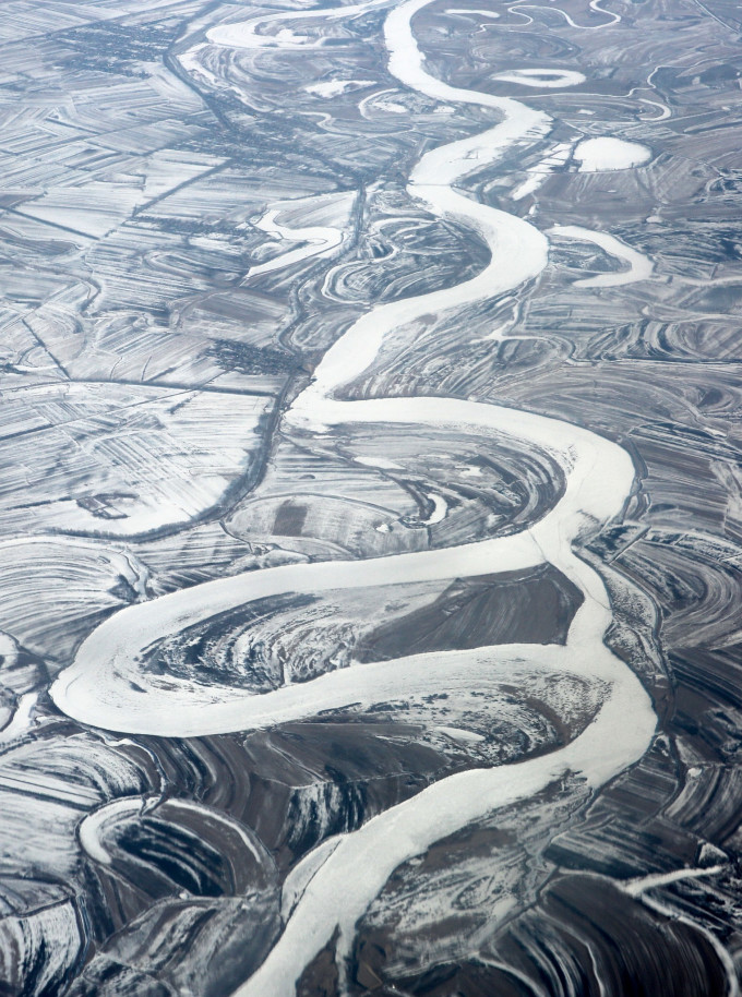 飞机上看东北的黑土地全部被白雪所覆盖,东北大平原是中国最大的商品粮生产基地。田园、江河分割明显,一幅幅水墨画!