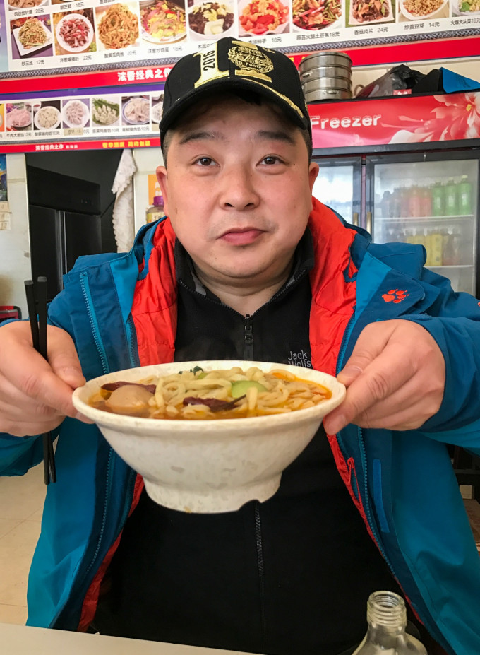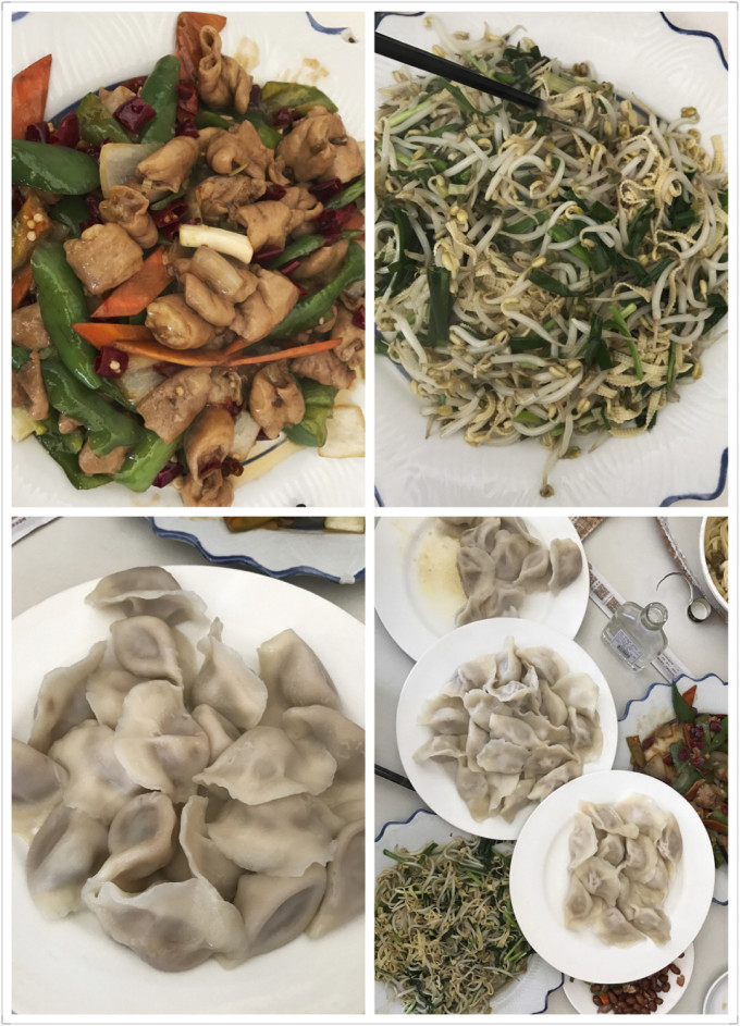 (哈尔滨地面温度11度,感觉不到冷)下飞机已经临近午饭时间,租赁的商务车也载我们去品尝东北的第一餐!东北饭菜量足,上来就是一大碗,20个水饺12元,什么打卤面、牛肉面,在整几个小菜,喝几瓶啤酒加一瓶小白,7个人的午餐130元吃的你撑不下!