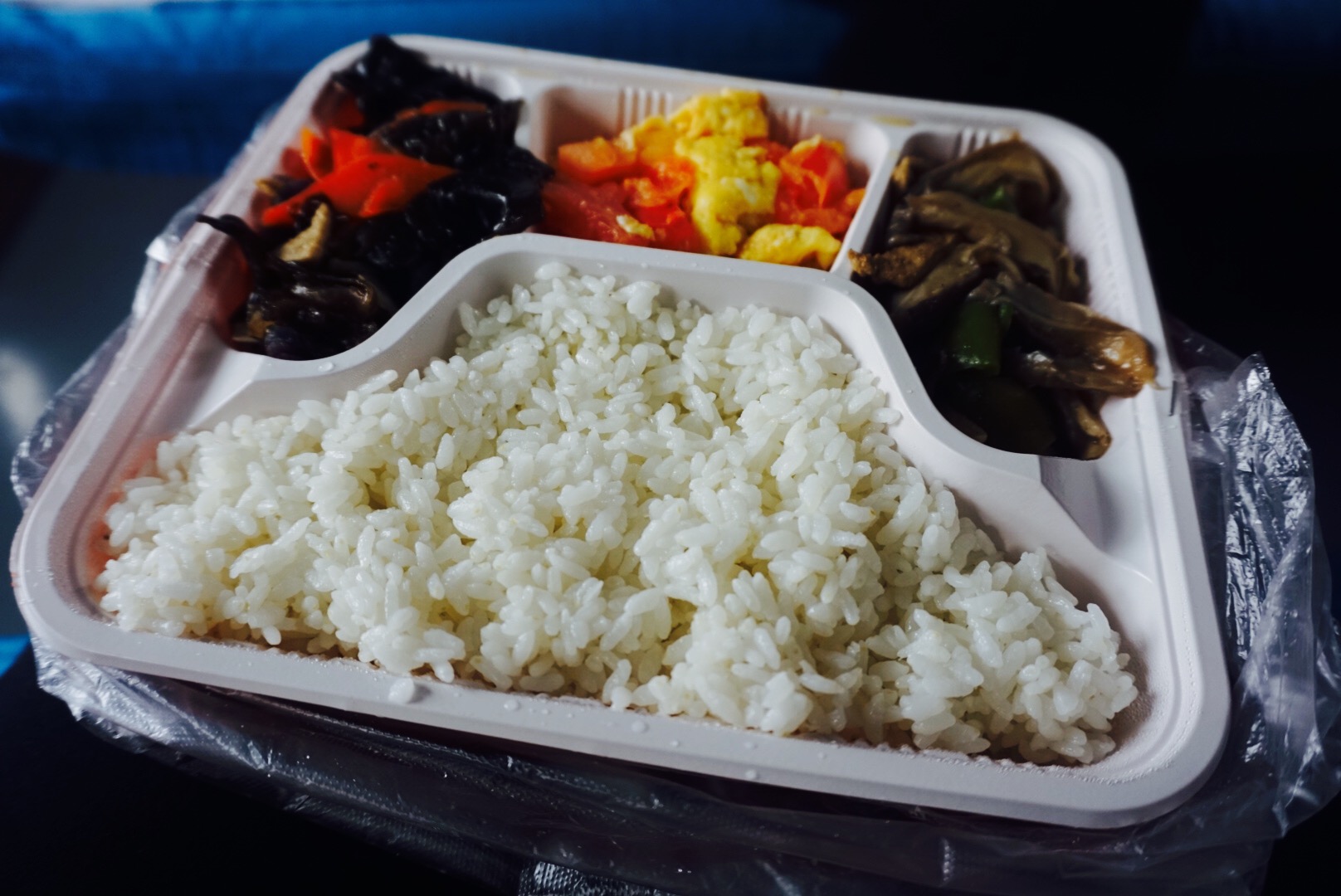在丹东火车站的时候中方导游把九人份的盒饭分给我们,所以不用担心在路上没有午饭吃。