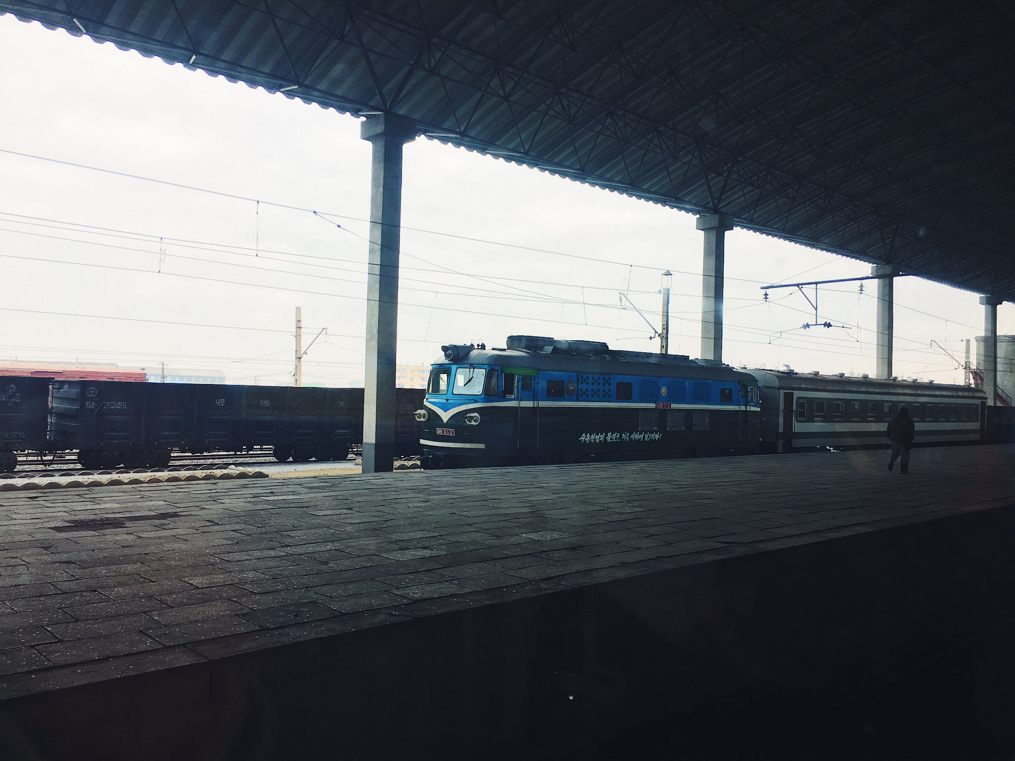 火车在这里停下,朝鲜人民军上车,开始进行长达两个小时的入境检查。这个时候,所有人开始莫名紧张起来。第一次近距离的看到朝鲜人民军,他们穿着军装,胸前佩戴着大胖和二胖头像的徽章,脑袋上顶着帽檐巨大的军帽。在这两小时里,我们只能待在火车上,不能下车走动,特别注明不允许拍摄朝鲜军人。
