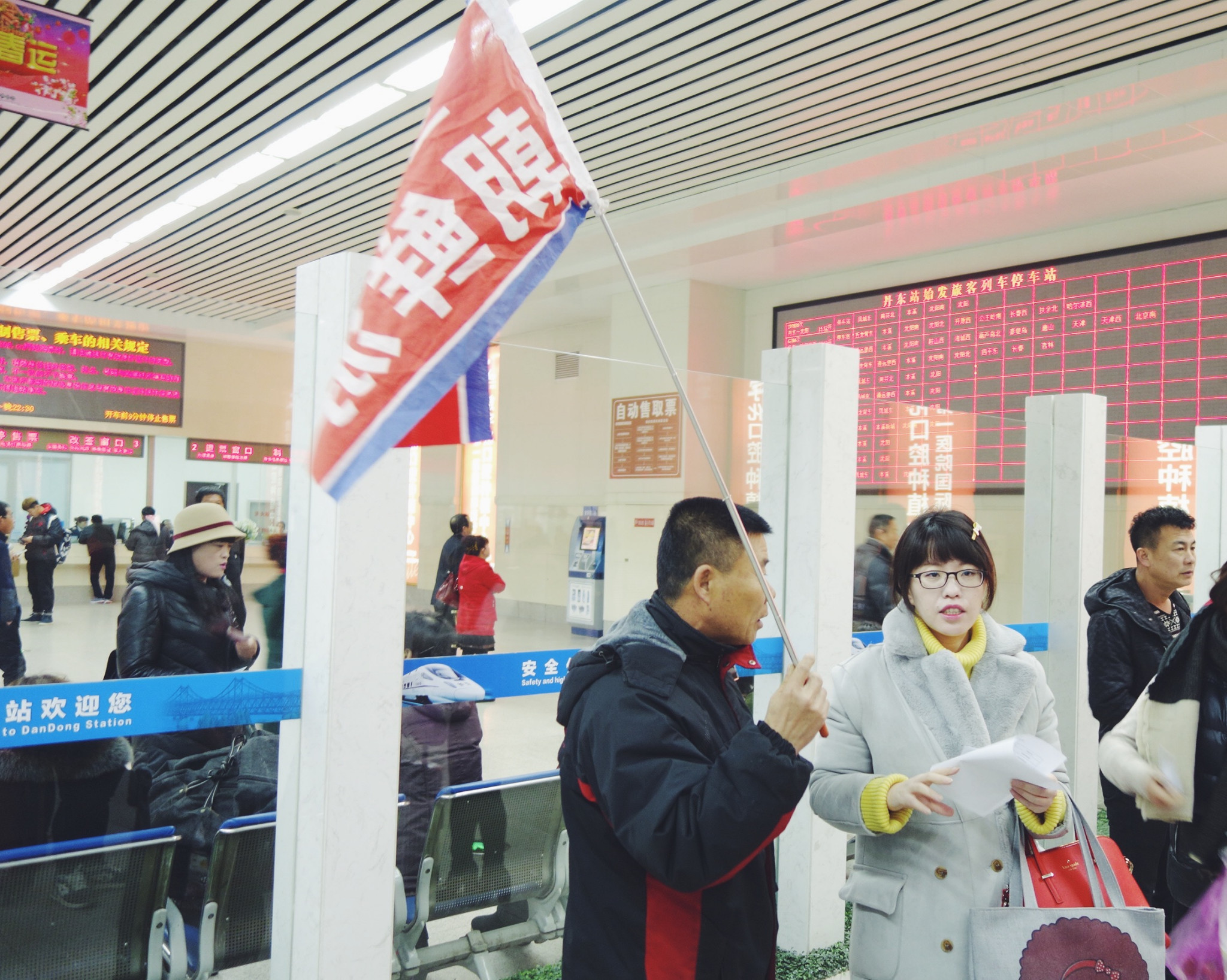 根据微信孙导的指示,第二天早上八点半在丹东火车站的售票处,找“三千里朝鲜游”的红色导游旗集合。