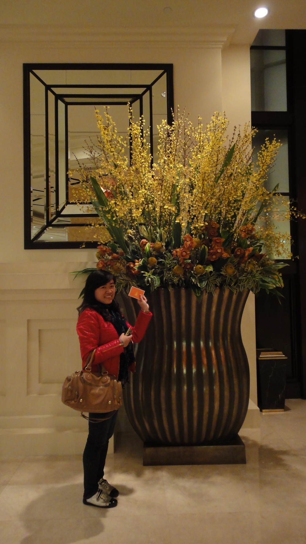 一路走过,看到了很多想看的美景,算都没有算的这么准,当我们走到“永利”门口,大家都知道永利里有个特色表演吧。以前来澳门 时,导游都是算好时间来看的。这次我们真的是运气不错,刚刚走上这个阶梯,就听到门里传来表演的音乐,哈哈,表演正好开始!