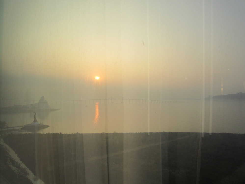 D2:一早,拉开窗帘,有点雾蒙蒙,太阳升起了,远处是海上观音