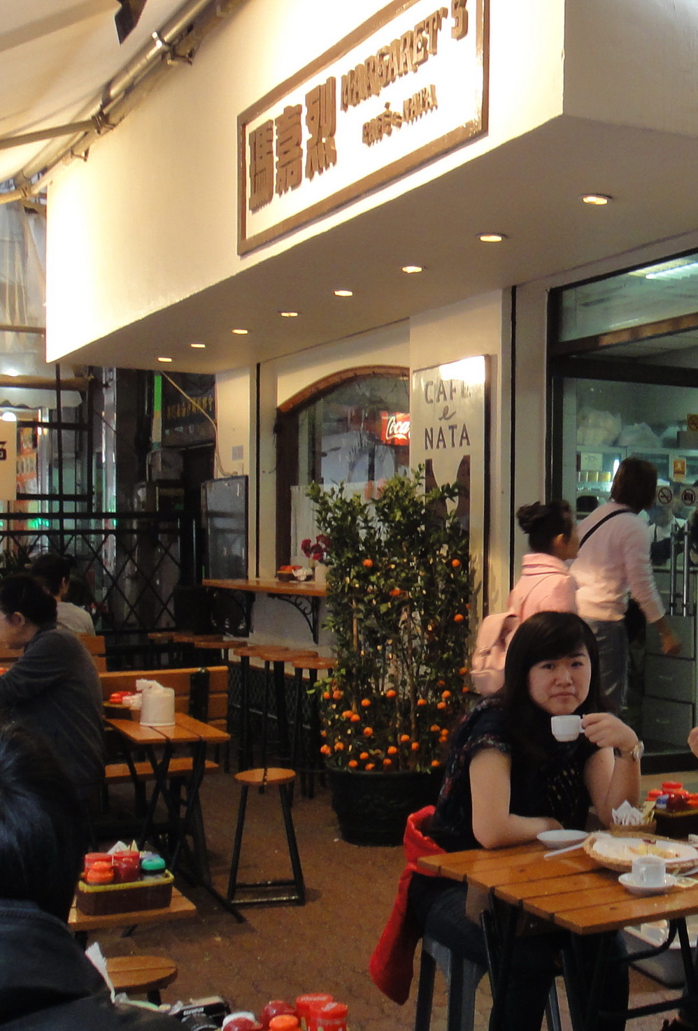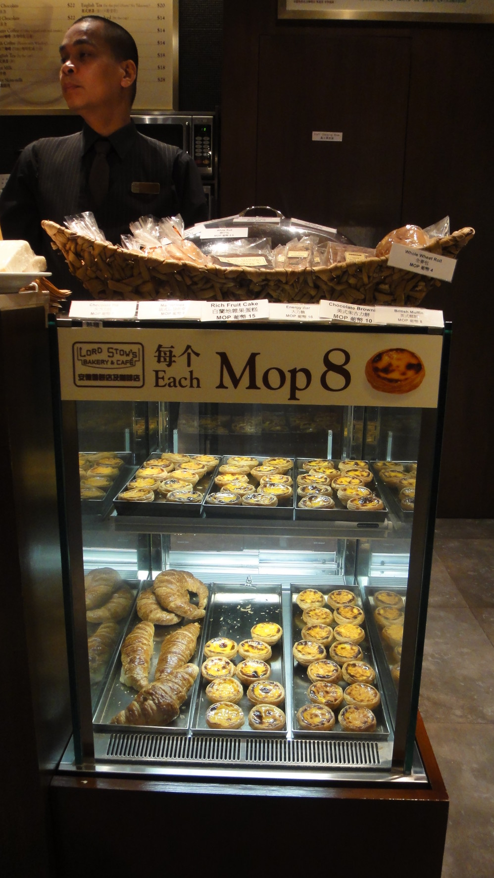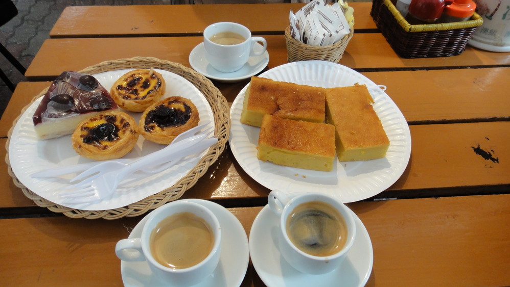 我们点了细卡(超小杯咖啡)、车厘子蛋糕、马铃薯布丁(其实店里不叫布丁,叫什么我忘记了)当然还点了超有名的蛋挞。这个蛋挞吃上去外皮酥脆,里面则是QQ的,甜度适中。比起上海 的莉莲蛋挞,当然还要有料。不愧为当地的特色啊。