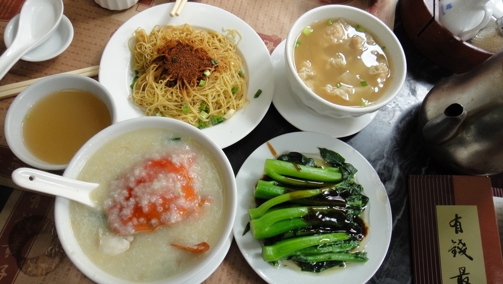 中午时分,我们继续开吃。一定要尝遍澳门 的特色,是我们此次行程的重点之一。黄枝记面家,当然我们是做好攻略来的,特色都要点上,虾子捞面,鲜虾云吞,水蟹粥,外加个蔬菜。