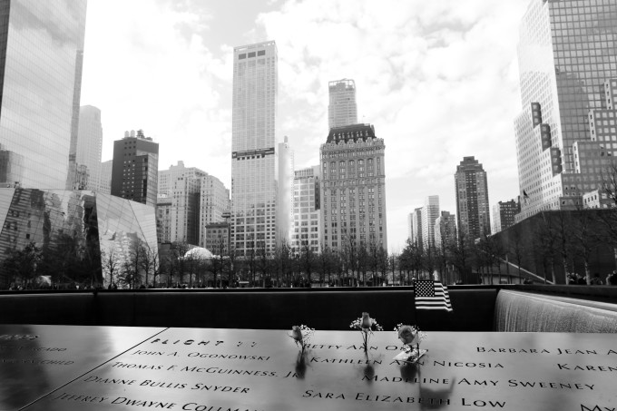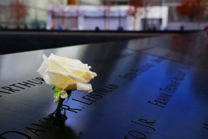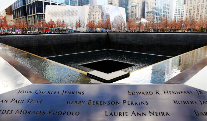 大坑四周用大理石砌的矮墙上刻着在“911”事件中全部罹难者的姓名。罹难者的亲人在名字上插上鲜花进行悼念。
