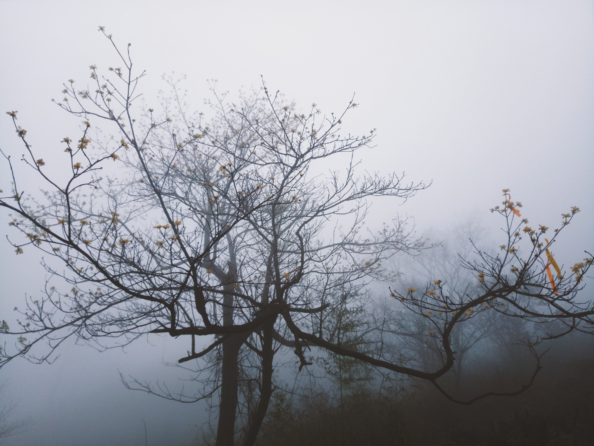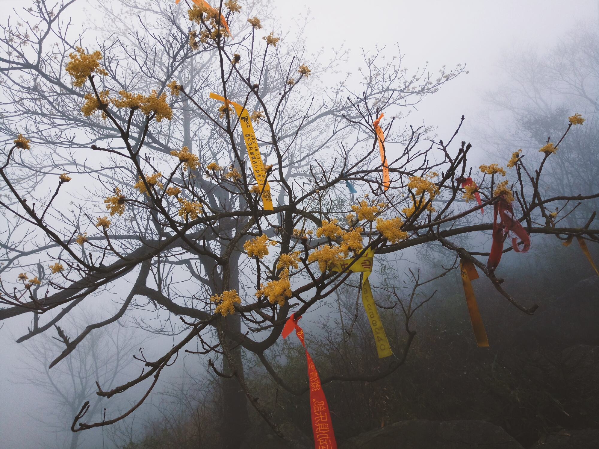 在爬石浪后半段看到的腊梅,在山间雾气下,蜡黄色的它格外地美,像是山林中处世的仙子,枝条上挂着其他户外组织的彩条,也更添了份入世的感觉。