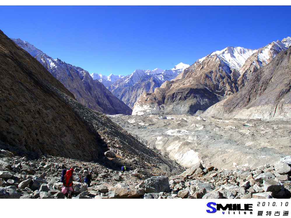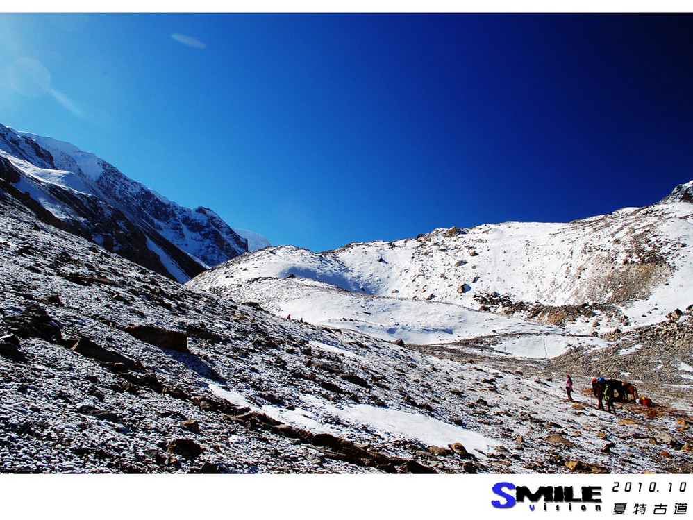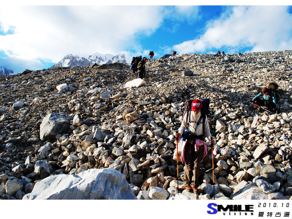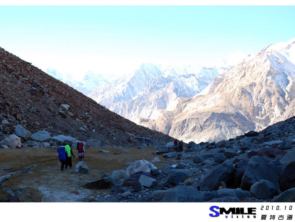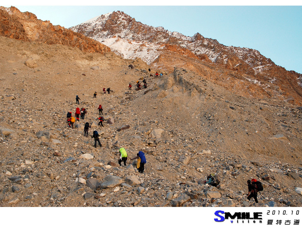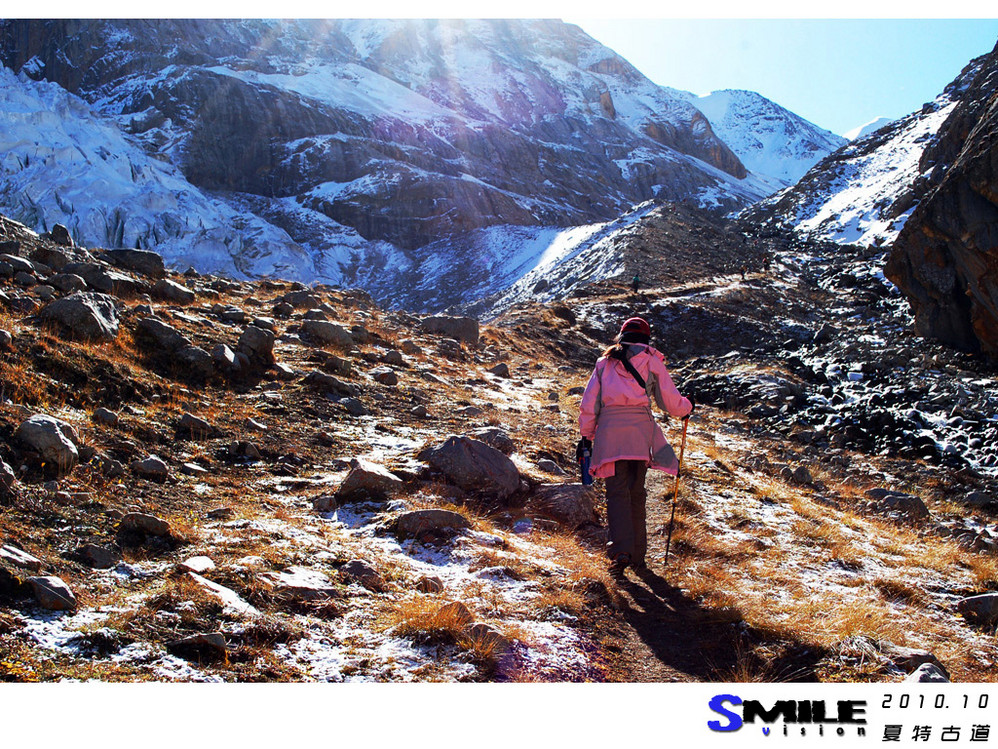 翻过达坂,开始往木扎尔特冰川上走。马匹卸下全部行李,终于要自己背上25公斤的登山包,开始长长的下坡。