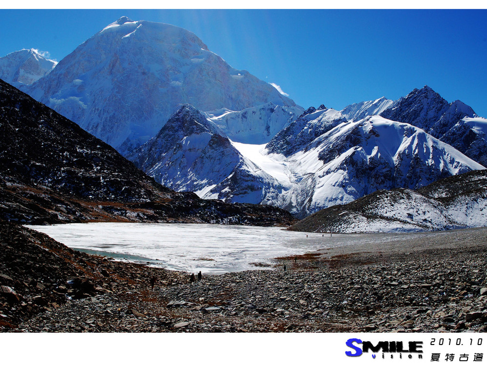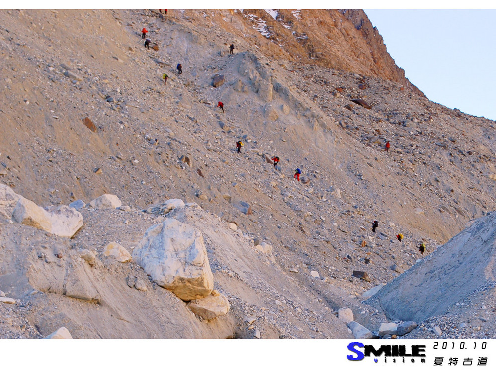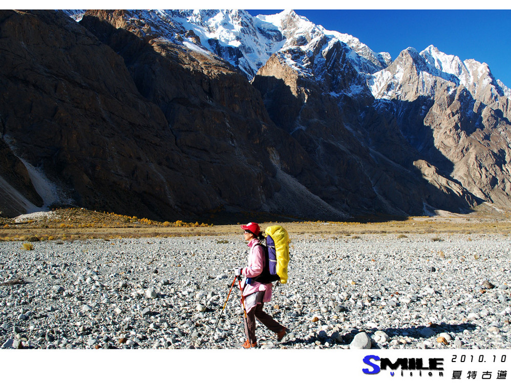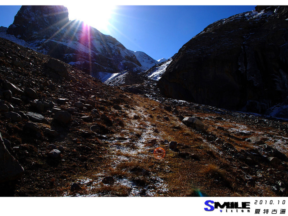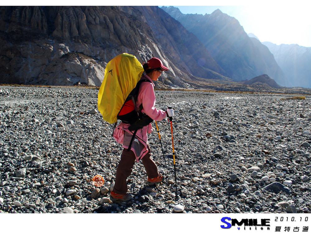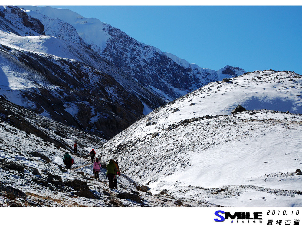 翻过达坂,开始往木扎尔特冰川上走。马匹卸下全部行李,终于要自己背上25公斤的登山包,开始长长的下坡。