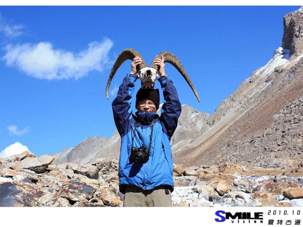 捡起一个北山羊的颅骨,举在头顶才发现如此沉重(小蒋摄)
