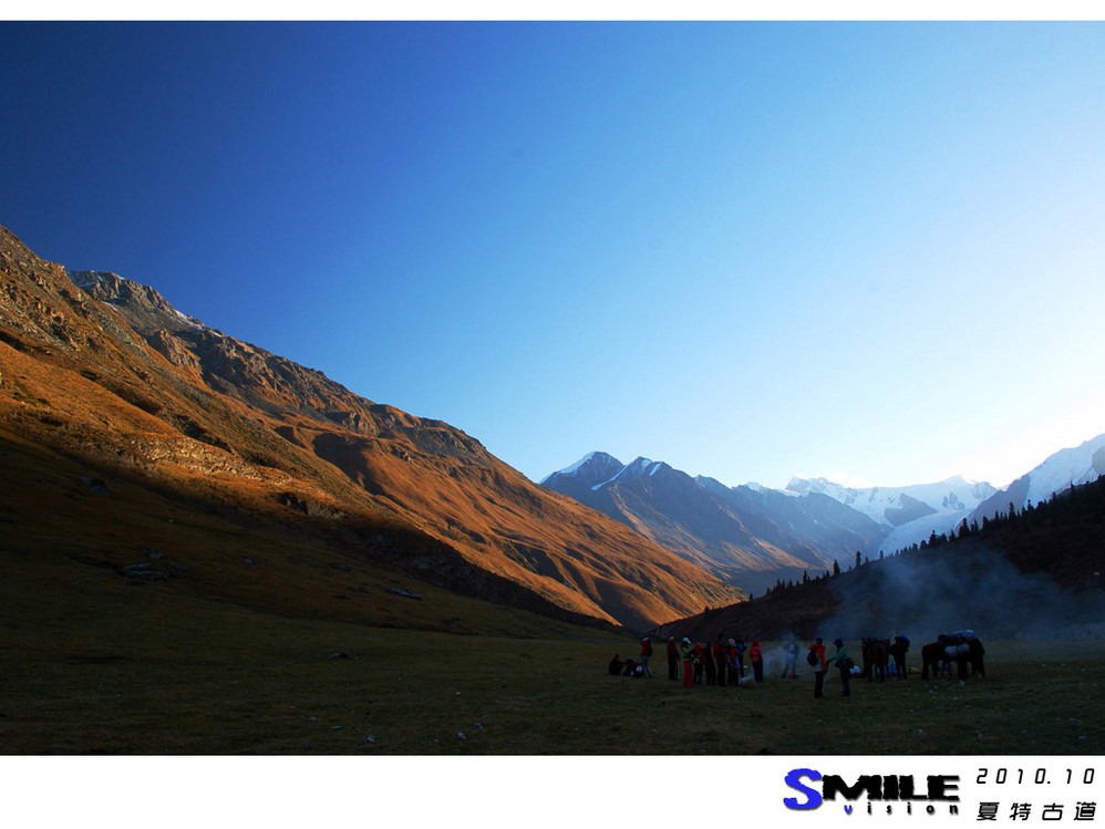 拔营,早餐,阳光穿透烟雾,留下淡淡的神秘。