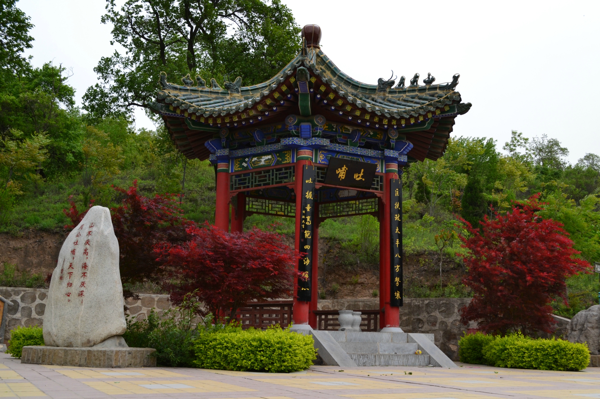 周公庙位于岐山县城西北7.5公里的凤凰山南麓,距今已1380多年。庙区现存古建筑30余座,占地约7公顷,整体建筑对称布局,殿宇雄伟,亭阁玲珑。庙内现存碑与石刻众多,并有汉、唐、宋、元、明古木 多株。周公姓姬名旦,是周文王 的儿子,武王的弟弟,成王的叔父。他生于岐邑 ,死于丰都 (今西安市 西),曾辅佐武王伐纣 灭商,建立周朝,是周王朝的开国勋臣。武王死后,成王即位,少不更事,由周公摄政。在此期间,周公率军 东征,平定 了管蔡之乱 ,稳定了周初政局。同时,他还制订礼乐,建立朝纲制度,为巩固新兴的周王朝作出了卓越贡献。他还制定的一套君臣、父子、夫妇、上下、尊卑、贵贱等典章制度和礼节法规,为封建社会的伦理道德奠定了牢固基础。这对健全国家机构、稳定社会秩序、促进经济繁荣,起到天下大治的作用,是法家的创始人。“周公吐哺,天下归心”,一直为人们所乐道,周公不愧为中国 古代杰出的政治家。