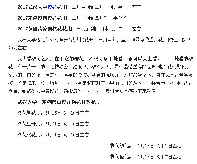 春天来武汉旅游的最佳时间自然是樱花季啦,每年的三月底到四月初左右,时间不固定,每年的温度都不同呗,下图是我网上找的今年的花期。大家可以参考。