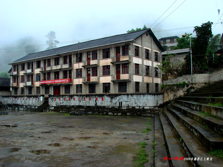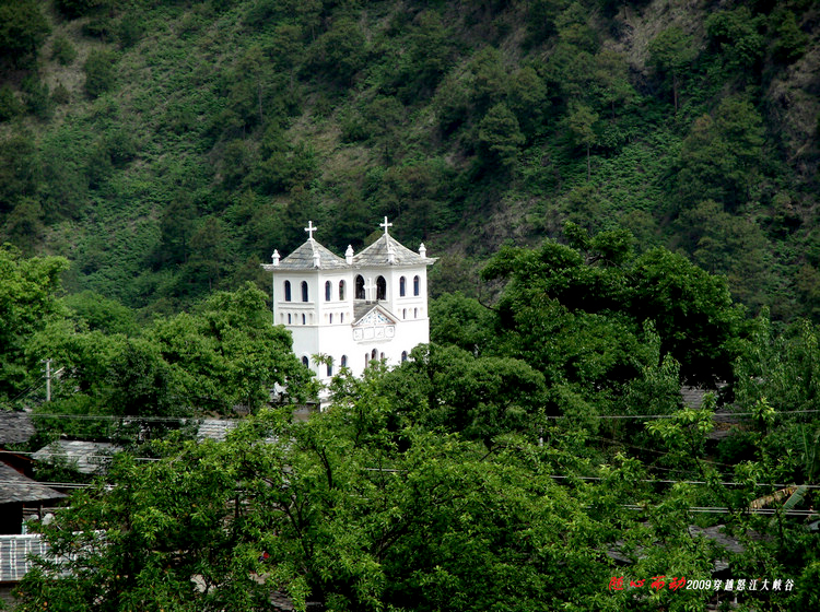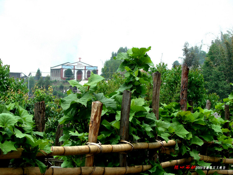 8:00许离开六库沿228省道前往贡山。228省道沿怒江而建,是穿行怒江大峡谷云南段的唯一大通道,二级柏油路面,弯多路窄,一般为双向两车道,但不少路段是在峭壁上开凿的,要窄些,地势稍宽处建有会车点。天空飘着小雨,脚下是咆哮的江水,江两岩壁高耸,不免让人有些压抑。此时此刻对“山高谷深,水声如吼,故名怒江”的说法感同身受。路上遇到过水毁路段,还偶有飞石落下。人们说起怒江大峡谷往往冠以“神秘”二字,我想个中缘由很多,但交通不便是一个重要因素。路难行,外面的人去得少,自然就神秘些。从车窗望出去,江两岸陡峭的山坡上洒落着星星点点的农舍,村落附近的山坡开垦着片片农田。由于怒江谷深水急不可航渡,在这里吊桥和溜索成了沟通大江两岸的主要交通方式。有人说,在怒江大峡谷有村寨就有教堂,而且江东多信奉基督,江西多皈依天主,一路走过来感觉似乎如此。