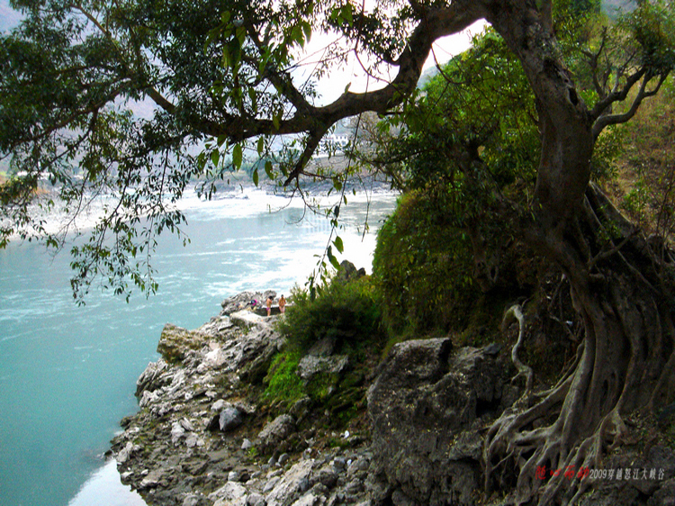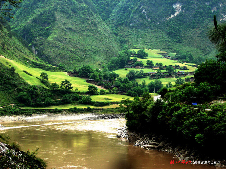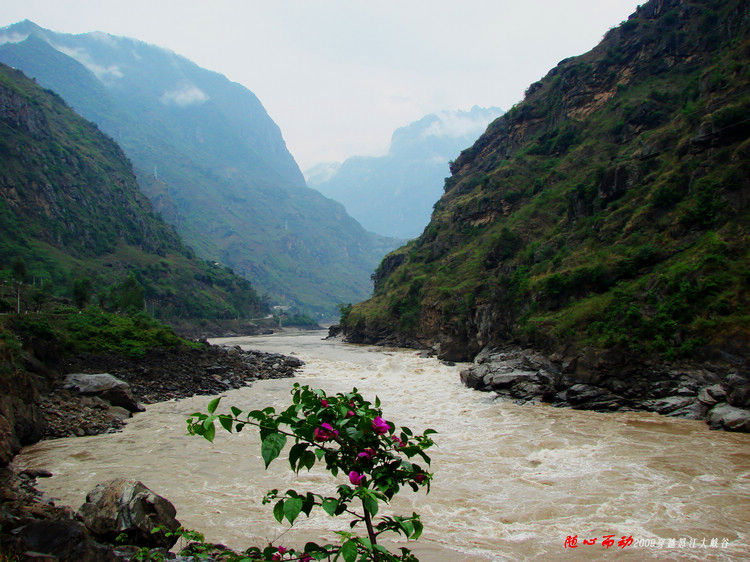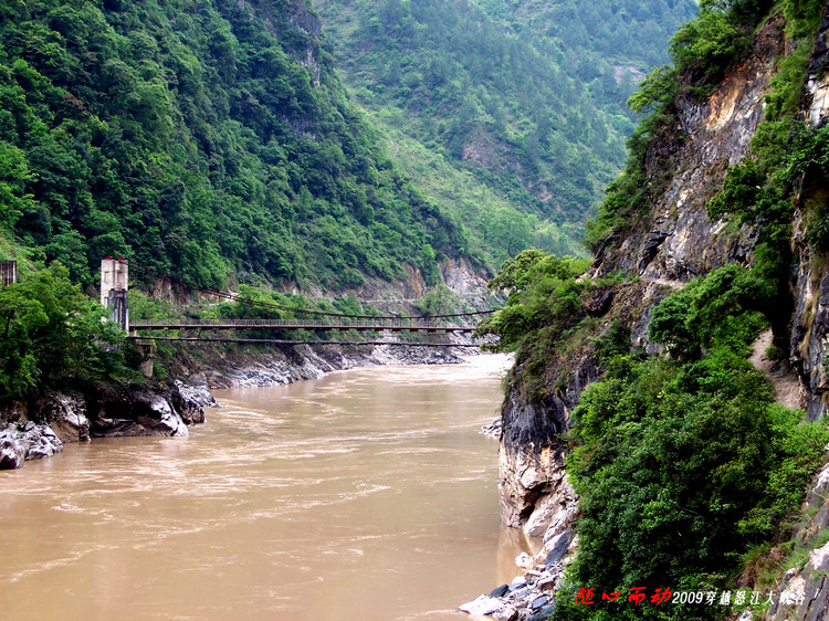 江水在峡谷中奔流。5月份上游开始下雨,江水浑浊了。一般每年11月到4月上旬江水是碧蓝的。