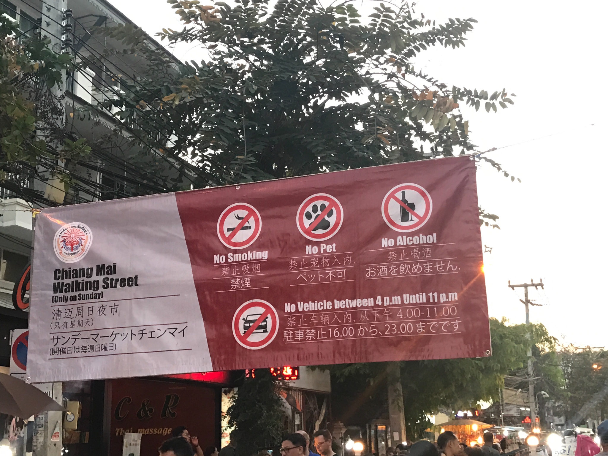 返途时目睹了一起车祸,出来玩一定要当心,自驾盘山公路有风险。回到酒店稍事歇息,今日周日,清迈双绝之一周日夜市便在今天,起点就在酒店不远处的塔佩门。
