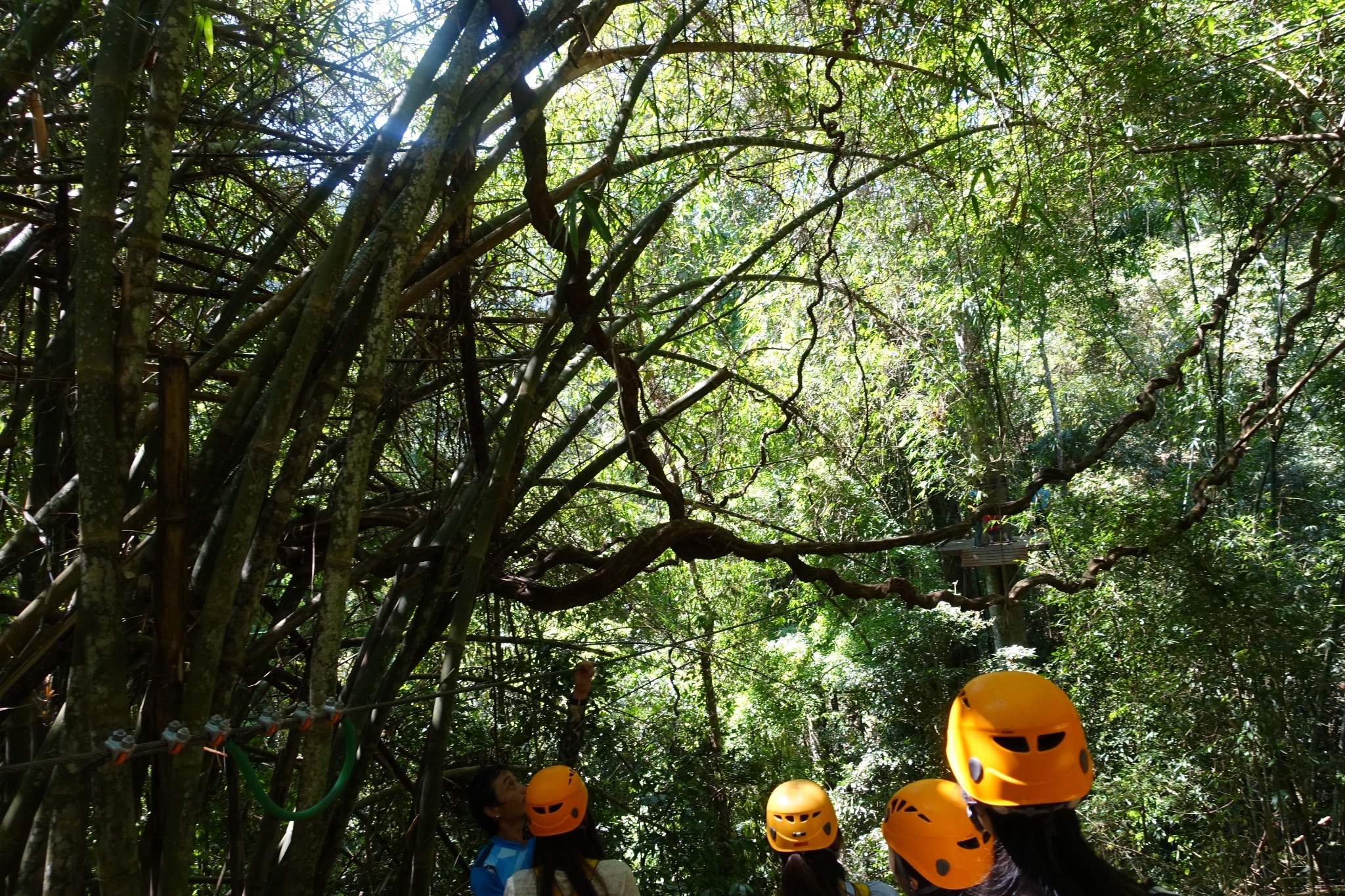 教练挺有意思的,在一处栈道,他叫我们去爬网,大家刚飞完着陆晕头转向,听信谗言就努力爬起了网。这时候他才会拍拍你的肩膀,让你去走旁边的扶梯……我中了招之后,还和教练一搭一唱,让跟在我后面飞到的菁菁慢慢爬,不要急。菁菁一边努力的爬网,一边问我,我要爬到哪里去啊?而今想来,仍是别有趣味。