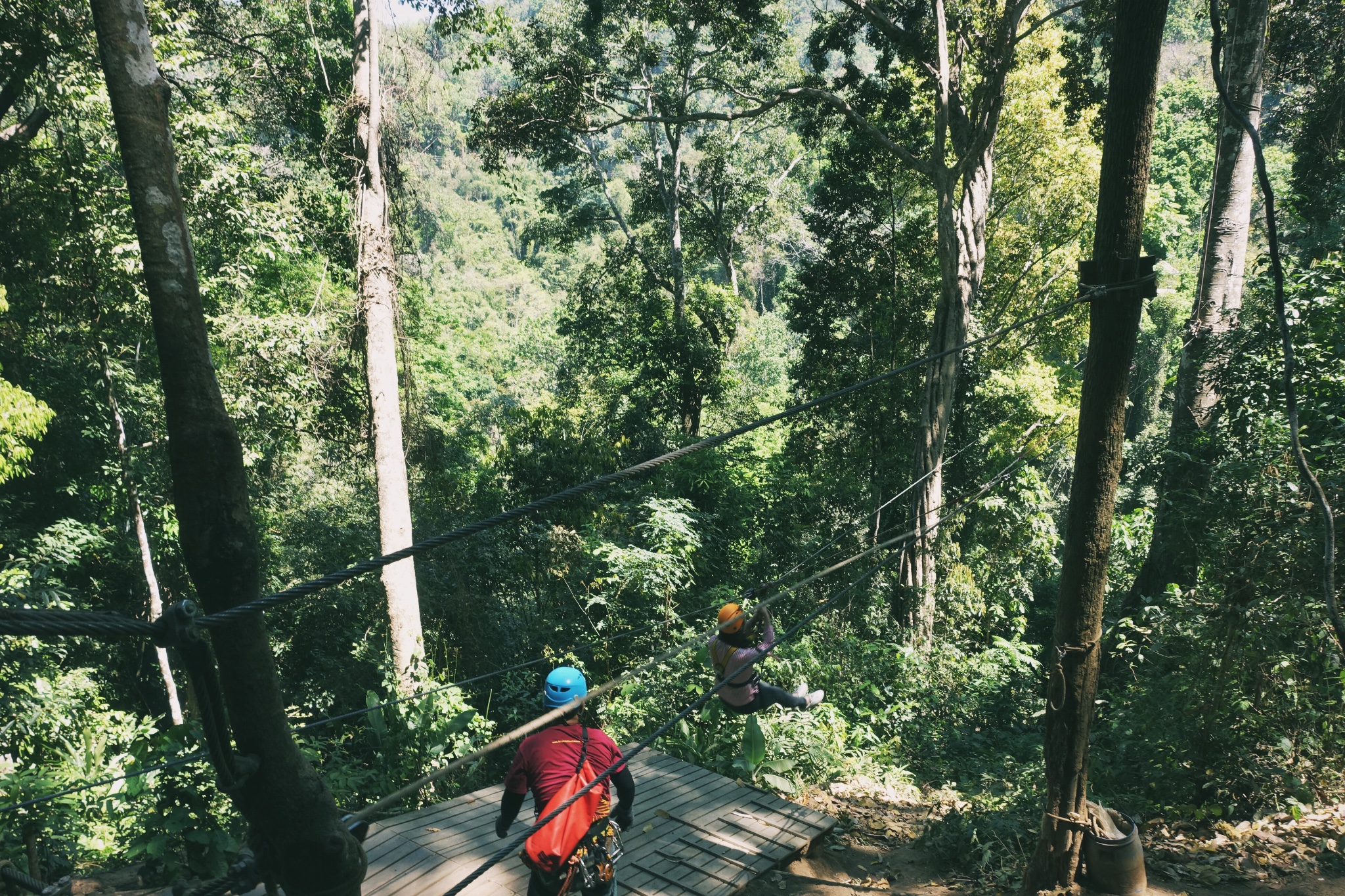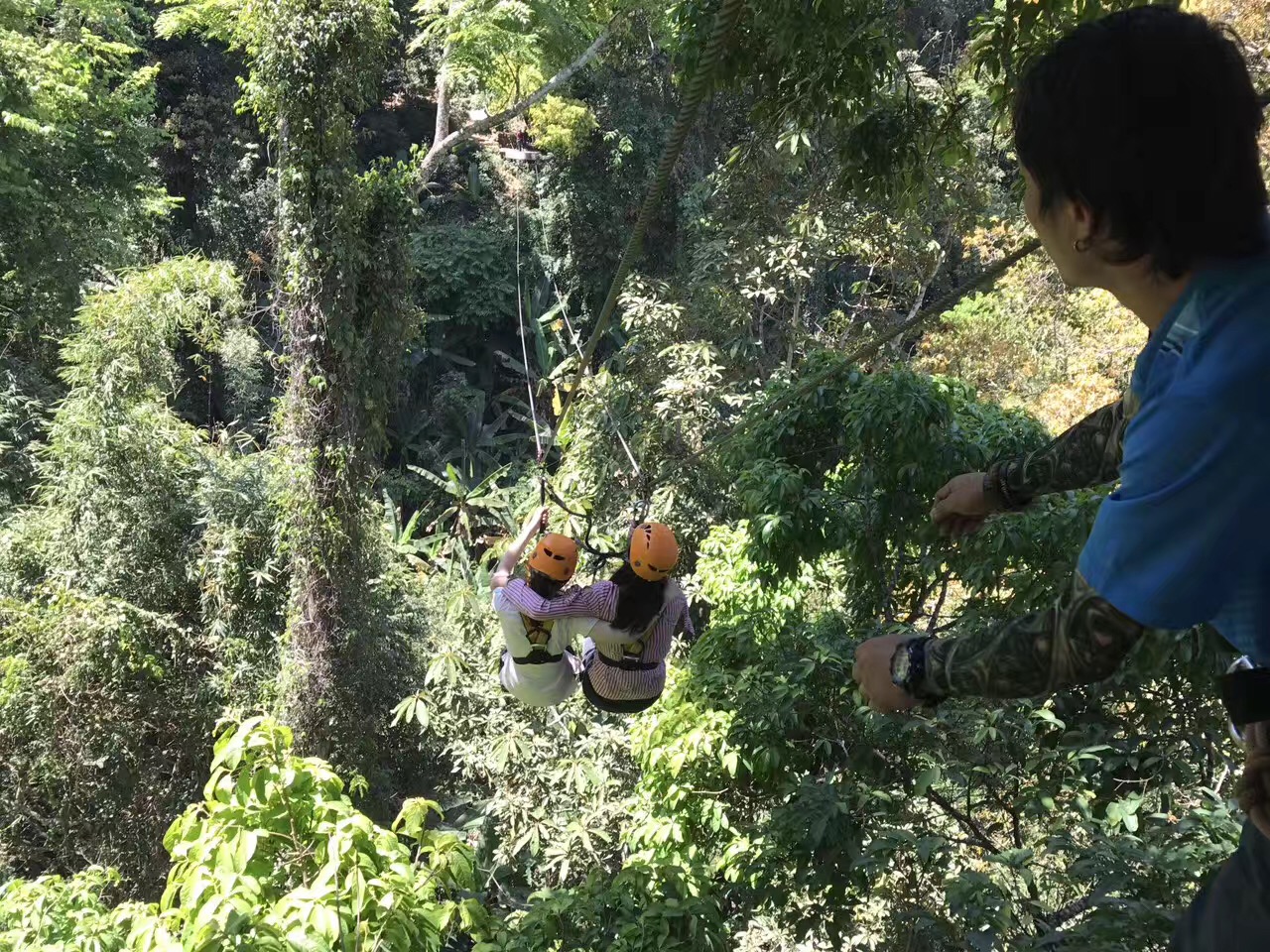 说到清迈,不得不提丛林飞跃。应该是年轻人来清迈必玩的一个项目了,这是在高山密林深处,呼啸而过的极速体验。知道有些人因为丛林飞跃丧了命,折了腿【阿白同事亲身经历】,我们选择了最贵安全度最高的“长臂猿”。两个教练一接一送,会说一点中文,安全度有保障,穿好运动鞋和长裤,吃饱早饭,可以“花样作死”了。