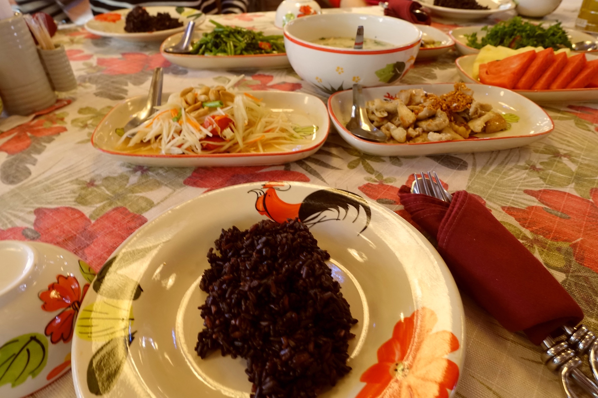 放飞自我两个钟头,早已经饿得前胸贴后背。丛林飞跃含午餐,环境也很好,一边淙淙流水,带来徐徐清风。午餐里面的的椰奶冬阴功鸡肉汤,美味到爆炸,之后喝到的味道,居然没有一个胜过此处。