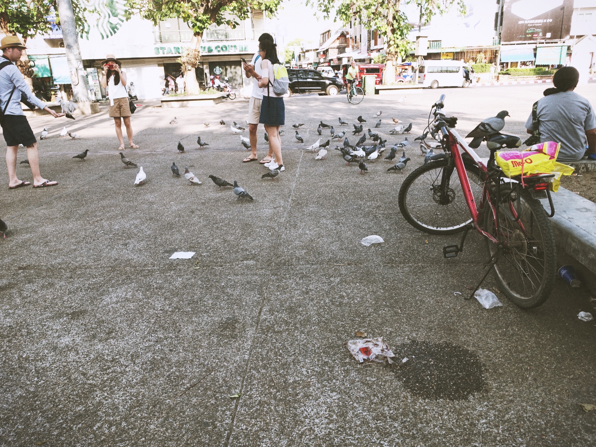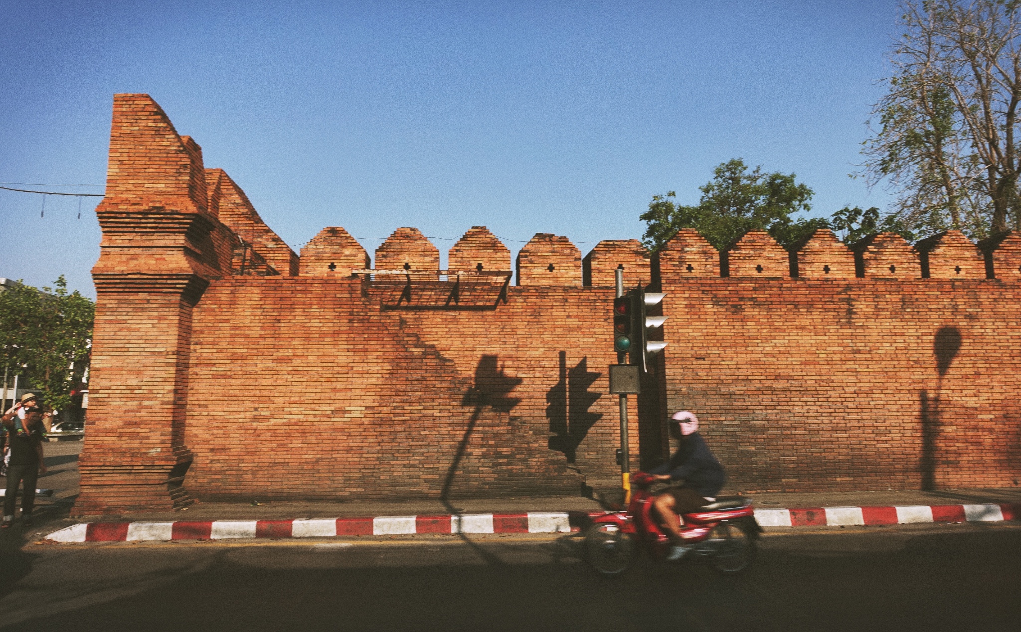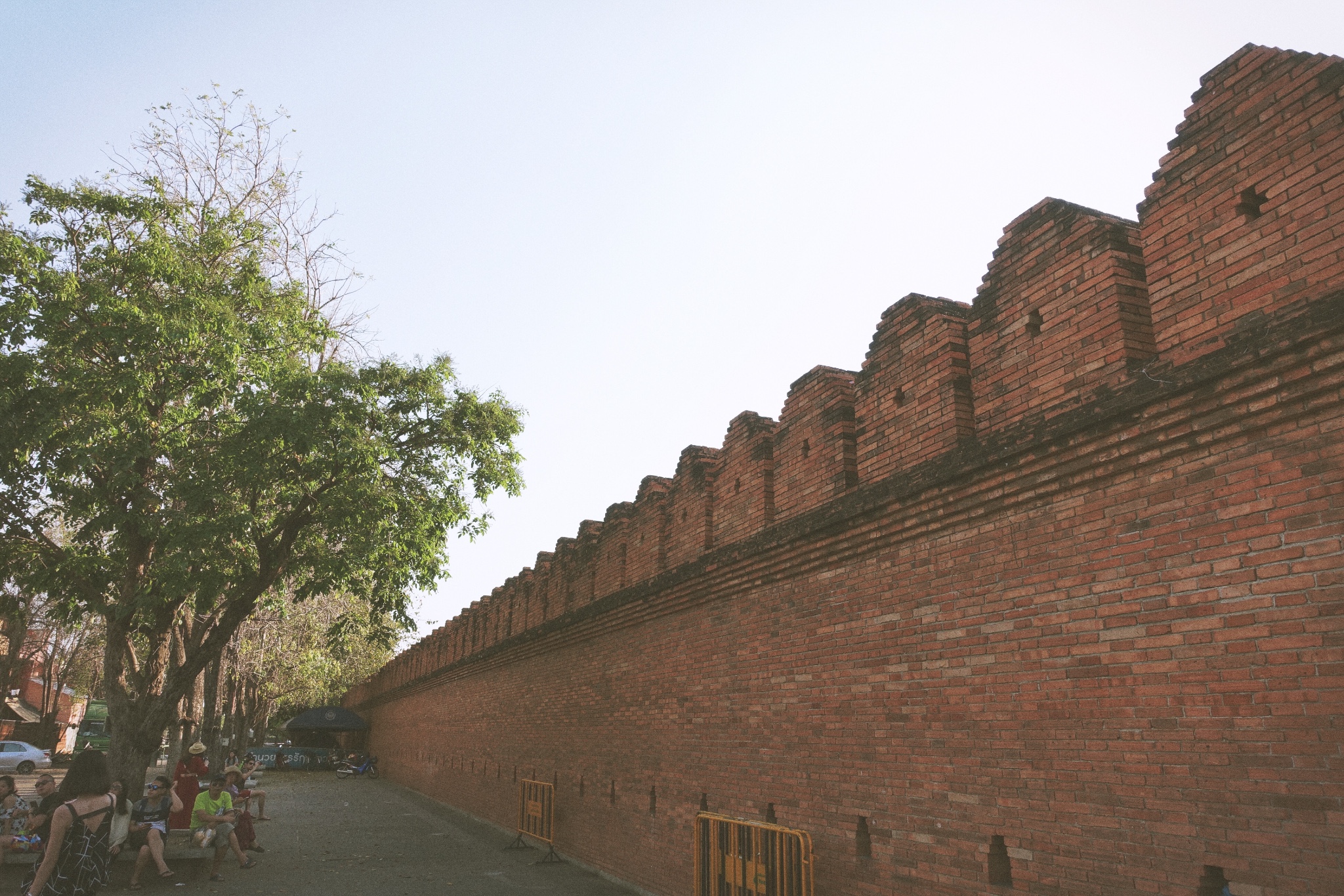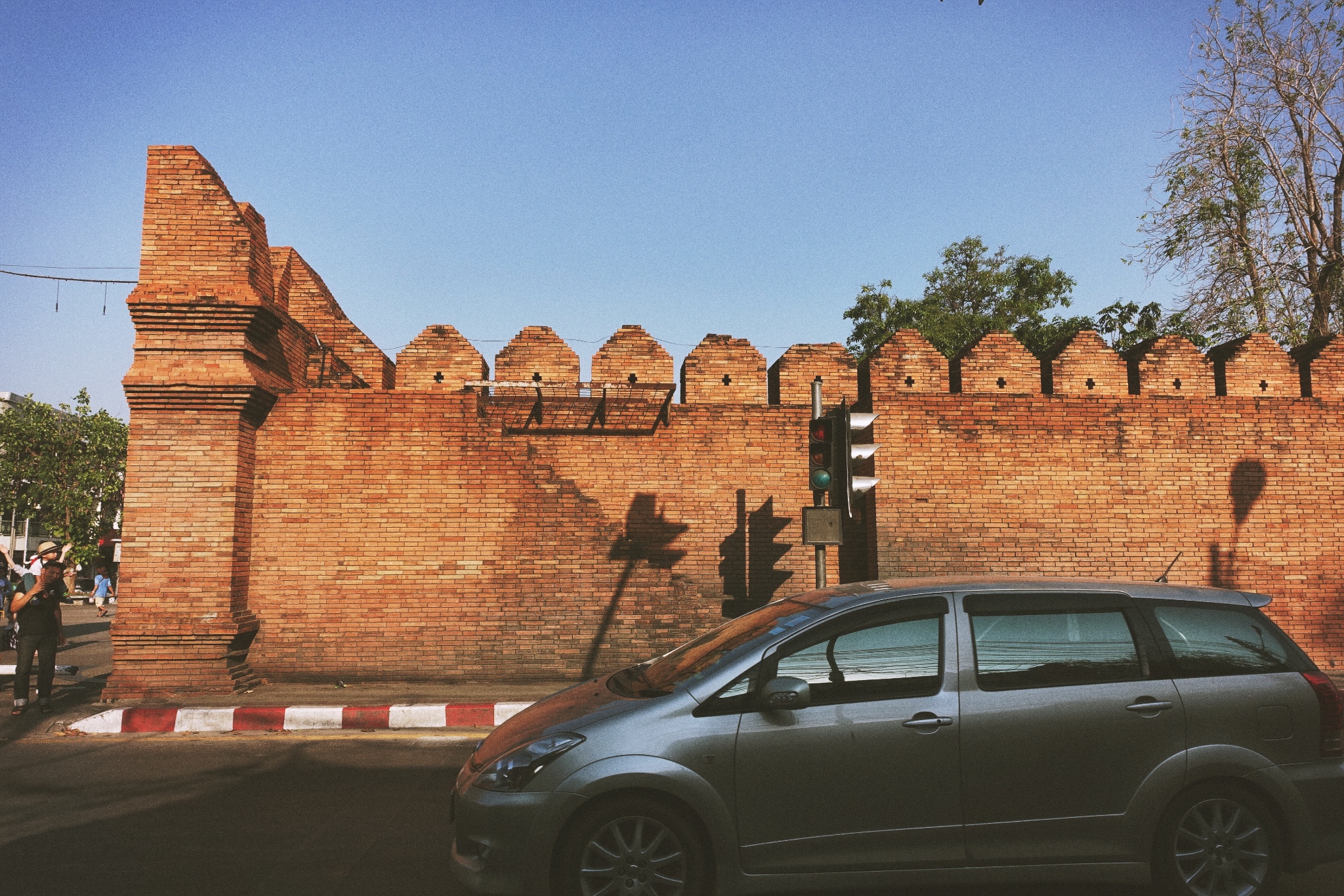 塔佩门,清迈古城的东门,门外就是新城,是清迈很好找的地标。夕阳西下,一群白鸽展翅高飞。如果没有这一波接着一波喝塔佩门合影的游客,意向一定更美。