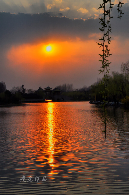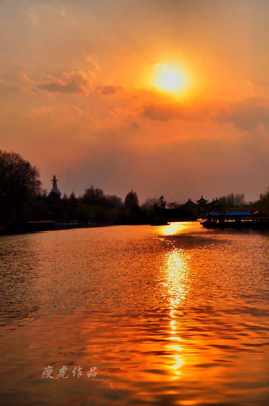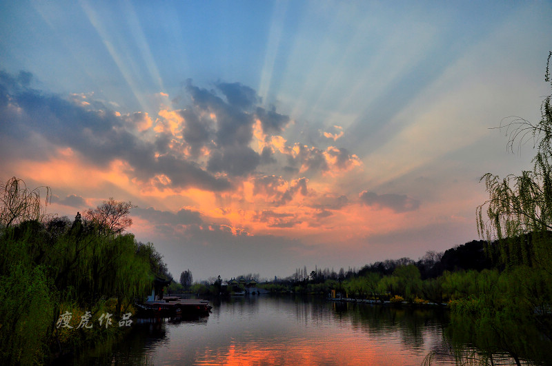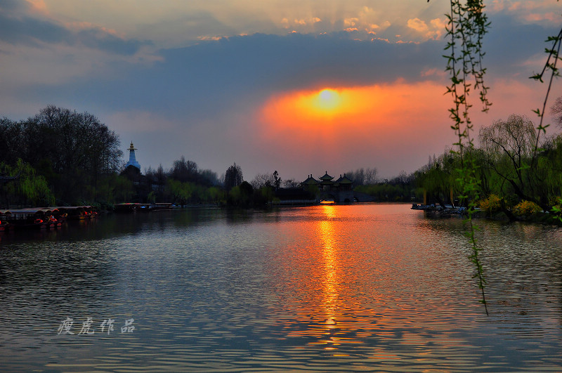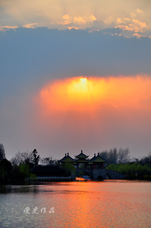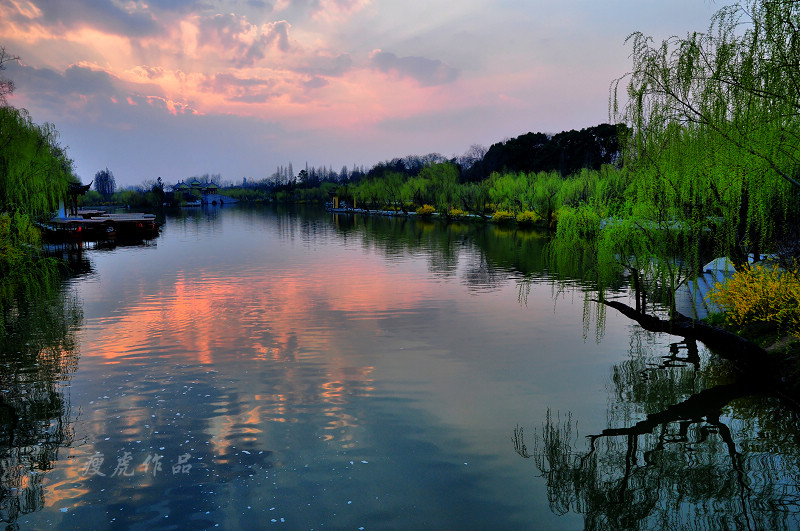看着快下山的太阳在云中穿梭,晚霞映照在瘦西湖平静的湖面上,美得让人窒息……