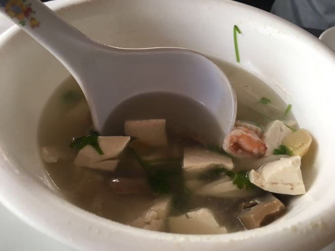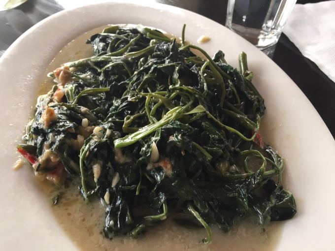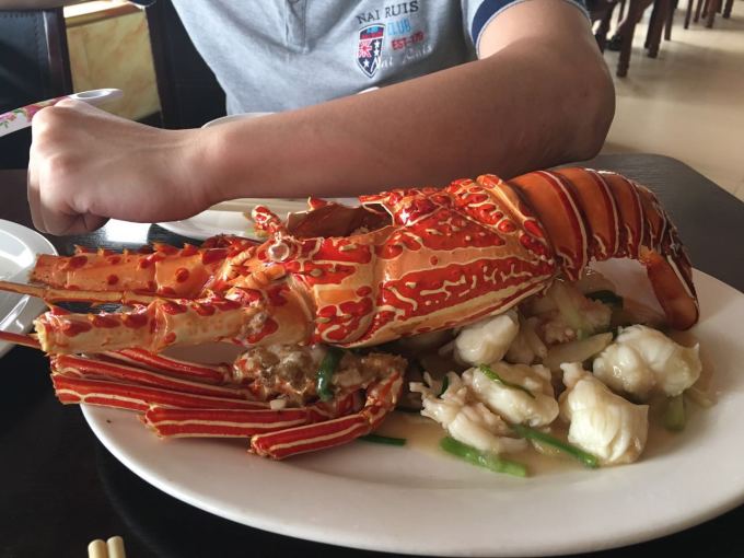 斐济新鲜海鲜-手瓜甘大的龙虾,非常鲜甜!没有芫茜的芫茜豆腐汤,有海鱼块与虾仁,。。。。。。。一个很咸的炒通菜。