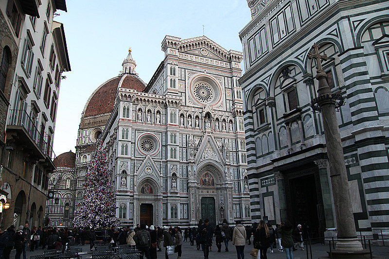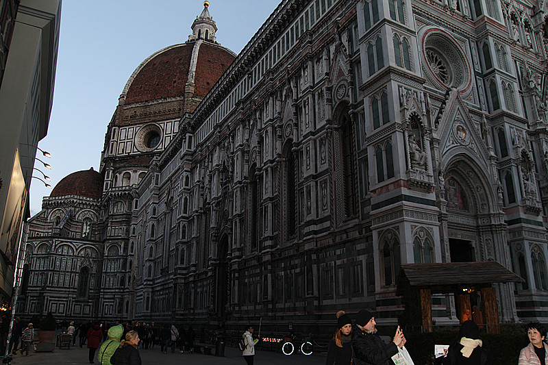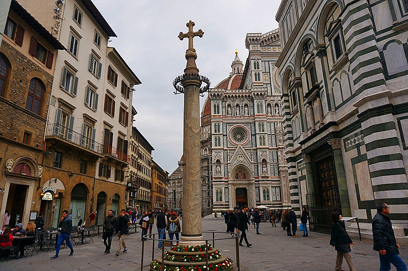 这一线和其他很多城市的主教堂广场一样,也同样是一大片壮观的建筑群,颜色特别,尤其是圣母百花大教堂,这是欧洲第四大教堂,是世界历史上第一个无木质结构支撑的八角形建筑,教堂看起来很有亲和性,规模宏大,具有艺术气息。甚至很多人偏爱她更胜过巴黎圣母院和圣家堂,教堂里除了来自五湖四海的彩色大理石墙面,最让人赞叹的就是直径达四十五米的穹窿顶,全部只用砖块完成,没有任何支撑结构,完全凭借砖块之间精准的角度和相互作用力,我们不禁要赞叹,教堂和这座城市不仅仅占线着文艺复兴时期艺术家们的艺术天赋,还凝聚着他们在数学等各方面的智慧。