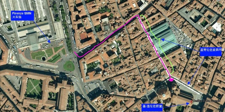 FMN火车站[Firenze FMN] ->学院美术馆(可选)[Accademiadelle Belle Arti di Firenze]->圣·洛伦佐教堂[Basilicaof San Lorenzo]->圣母百花大教堂[
