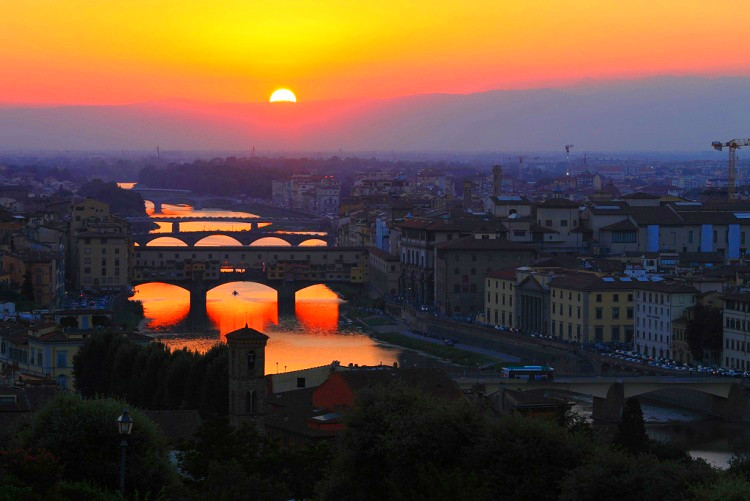 每个旅行者的心底或多或少的都会有份固执和坚持,真能达到随遇而安的境界的人不多。我最在意的是某一个地方的风景,一旦它没有按照我想象的方式呈现出来,就会心中充满遗憾,认为自己没有见到最好的,始终不能满意,而佛罗伦萨的日落,我没有遗憾。落日染红了整个西天,佛罗伦萨开始披上了金色的外套,