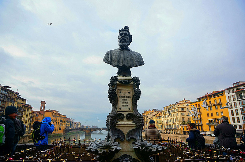 圣三一桥,相传但丁就是在这个地方遇到贝娅特丽齐的。但丁9岁就认识了天使般高贵温柔的贝娅特丽齐,而18岁时在圣三一桥的邂逅让但丁坠入爱河却无法表达他的爱意,很快他的女神就嫁了别人,几年后香消玉殒,才24岁。但丁当时的痛苦可想而知。后来,在他的不朽名著《神曲》里,他让天使贝娅特丽齐引导他畅游光辉灿烂的天国。日落在这里总是姗姗来迟太阳逐渐开始收敛起强烈的光照,呈现出柔和、饱满、红彤彤的霞光,洒向那些来自世界各地人们的脸庞。