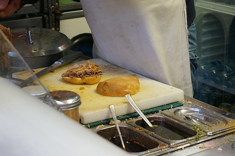 他向我推荐了三种口味,有辣的有基本的,各种配料都有,料多实在。夹在三明治中的很脆的烧猪皮以及很香的烧猪肉,应该还有一些土豆泥,还有更多的是分辨不出来的东西,反正混在一起之后口感非常好。