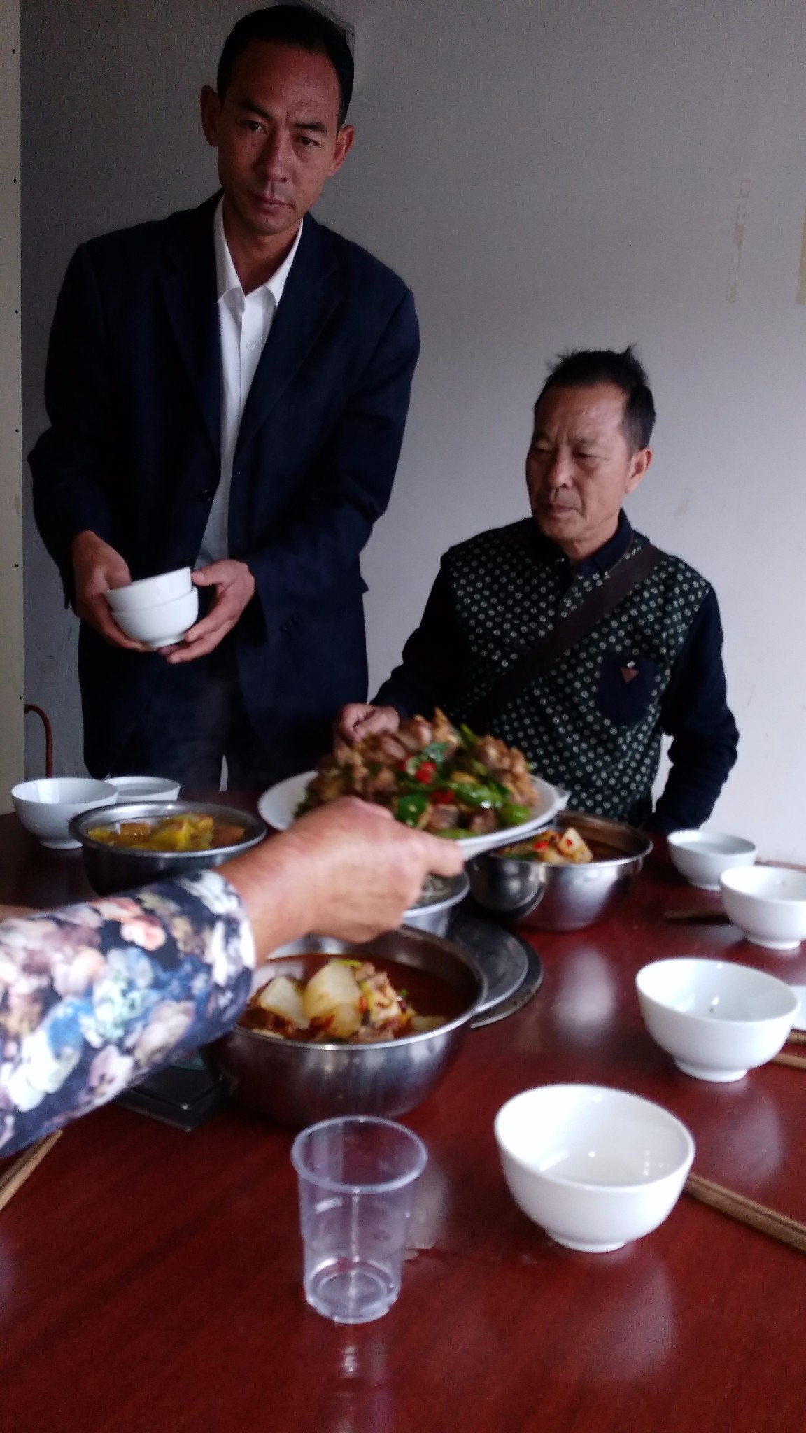 第二天老板娘老公邀请我们参加他的一个亲戚的结婚酒宴。遗憾的是我们到达婚礼现场时,结婚仪式已经搞完了,进入了酒宴阶段。由于人多,酒宴都是流水席。我们作为远方的客人,主人尽快安排了我们的坐席。我们也通过老板娘送了一个500元的红包。虽然酒宴是在露天举行,而且菜肴也很粗糙,但山里人的那种质朴、热情却也给我们留下了深刻的印象。踏着夕阳的余晖我们返回农家旅馆。次日我们依依不舍的离开了沙淤,驱车向下一个目的地----威宁驶去。