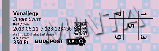适用于全线1-299,900-999,M1-4 ,H5-9布达佩斯行政边界内的单程票。打孔检票机检票后全程有效时间为80分钟,夜间车为120分钟。有效时间内允许地铁M1-4换乘。