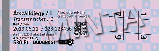 适用于全线1-299,900-999,M1-4 与H5-9布达佩斯行政边界内换乘一次的单程票。除M1-4之间的换乘,按号码检票且两段行程同时出示时有效。打孔检票机检票后全程有效时间为100分钟,夜间车为120分钟,第二次打孔检票后有效时间80分钟。如第二程为地铁,既是全程超过100分钟,二程有效时间仍为80分钟。如第二程为夜车,有效时间延长120分钟。