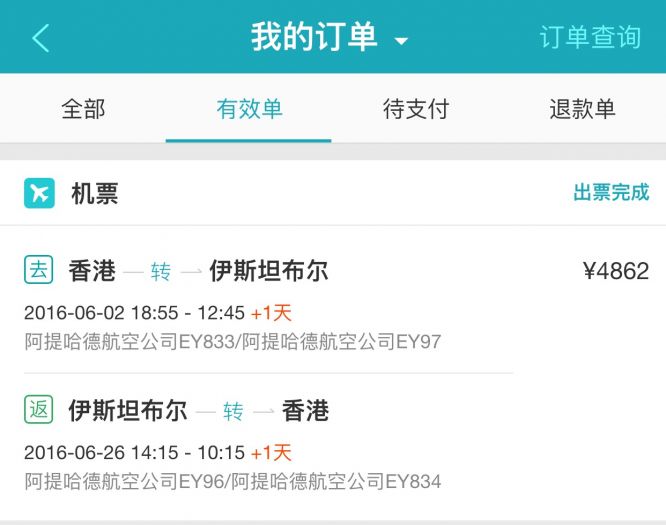 来自论坛促销信息,购买自去哪儿APP,人均往返2430元,阿提哈德航空:香港—阿布扎比——伊斯坦布尔往返 本来人均只要2000左右就好,因为选错了代理,小骆驼代理半小时出票失败,等得到消息价格已经涨了快400,南航虽然取消去伊斯坦布尔的航班,但中东几家土豪航空促销活动还是蛮多的,如果想去的同学请留意我们论坛的最新促销信息~~