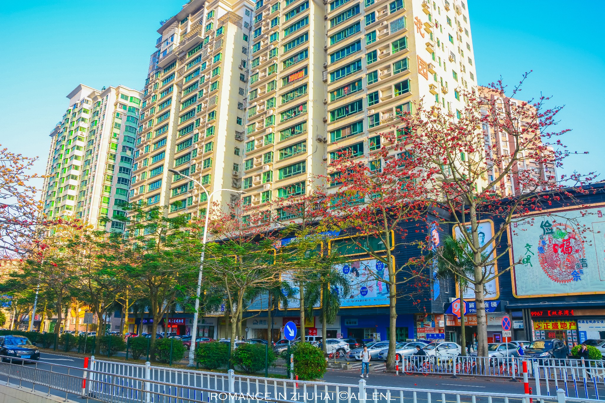 街道上的凤凰花开,给略显冷色调的画面增添一份暖意。