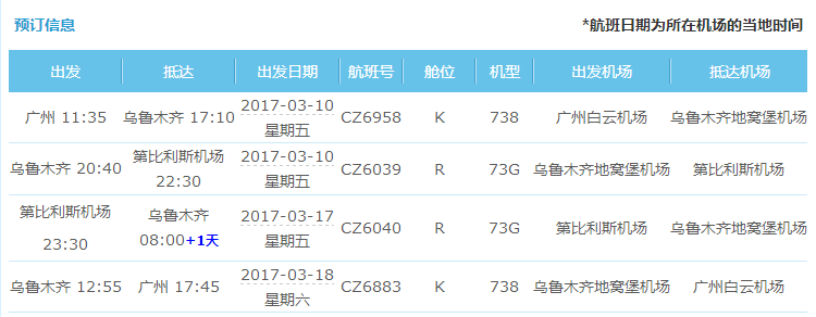 广州-乌鲁木齐南航 CZ6958 17:10 - 20:40
