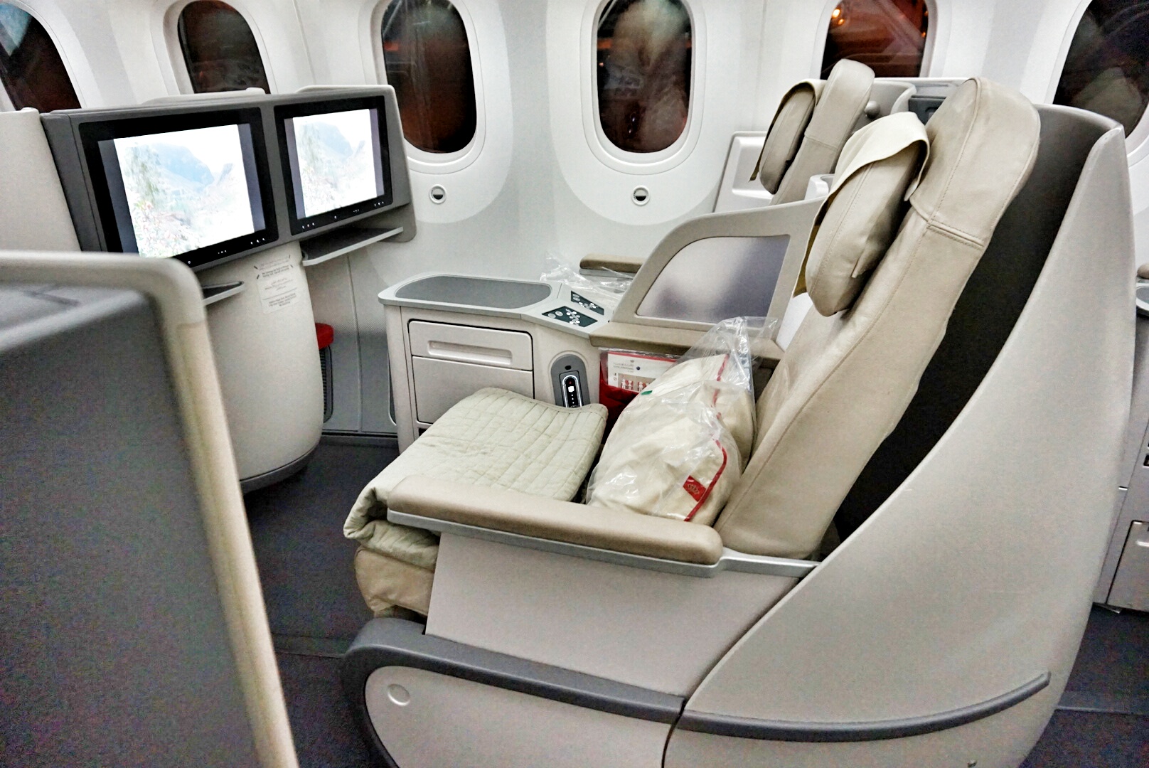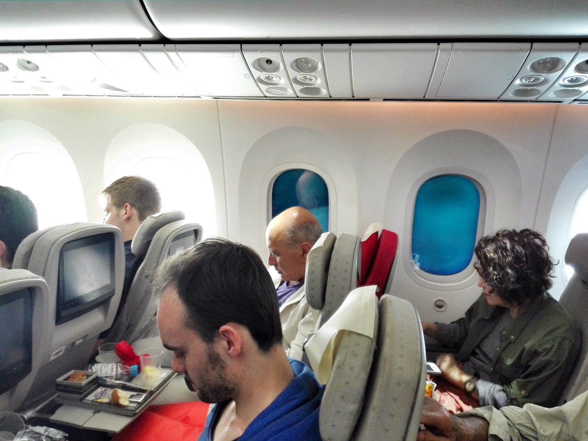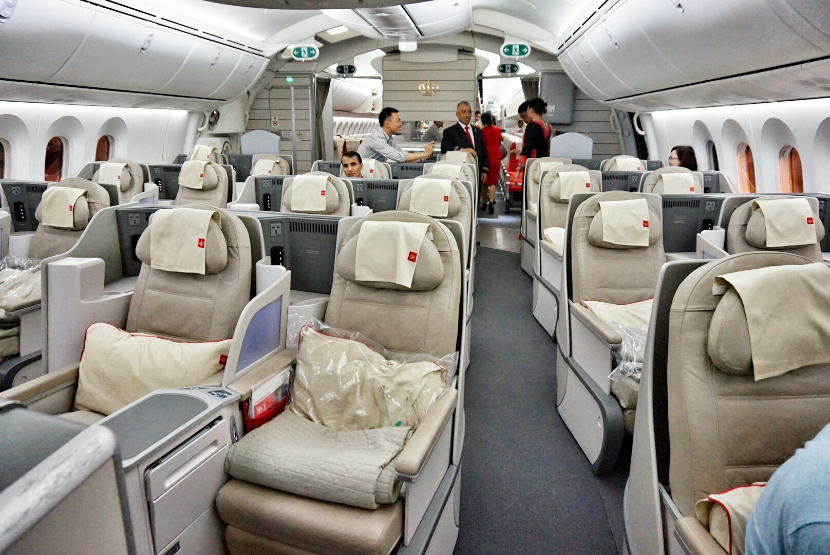 梦想787商务舱,24个座位,可以360度平躺,充电、阅读灯这些基本设备自然齐全。据约旦航空工作人员介绍,该飞机具备先进的空气循环系统,3分钟全机空气更换一次,且清新湿润,平时我们坐飞机会觉得整个人很干,而RJ则不会。飞机机身80%为碳纤维复合材料,韧性好,材质轻,所以才可以加大了机舱内的气压,以至于鼓膜外涨(耳鸣)情况不明显,人体较舒适,噪音也因此降低了50%。悬窗根据自然光线变换,视觉观感更加。行李舱设计特别大,流线型造型,哪怕是大了人也不会因此感到压迫感,空间反而更大。虽然我们回来的时候坐的是经济舱,但也不会觉得日子很难熬,重要的是我还睡着了(我坐经济舱,哪怕是长途,也从来睡不着),说明身体感到舒适,我想这和上面提到的这些优势因素有着莫大的关系!
