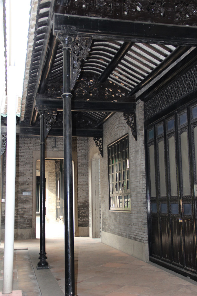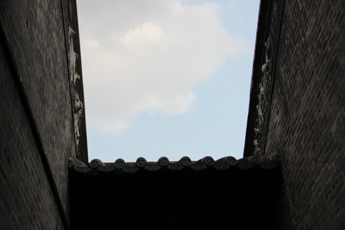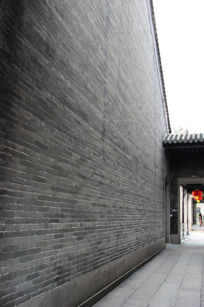 个人最喜欢这两边的巷子, 天气好的时候这里抬头能看到青天白云,而且建筑从前面开始一间比一间高,寓意陈氏子弟步步青云;因分隔了建筑空间,起到防止火烧连屋的作用,也叫火巷;因前后相通,地下铺排水管道,有通风排水的功能,又叫冷巷;夏天这里很凉快。走廊两旁是铁做的空心铁柱。铁柱纤细,下粗上窄,不会阻挡视线。100多年前将铁柱运用于建筑中比较少见。