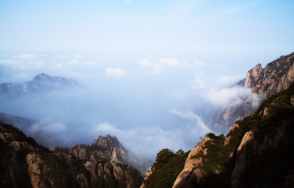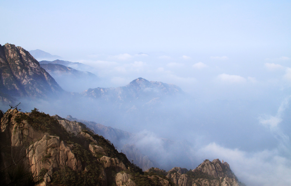 前面3张图是第一天上山时拍的,因为天气原因,也没拍到什么,其余的就是从光明顶到仙步桥拍到的云海了。这段我觉得是西海最值得爬的一段了,而且人少,旅行团都不会走这段的。我们是早上从光明顶出发的,这时候太阳的角度特别适合拍摄,然后下山经过其他有名的迎客松和什么峰的就没拍了,原因是太阳在正上方,拍了也没什么特别。再说,下山特别累啊,特别是前山特别陡,很不容易啊。