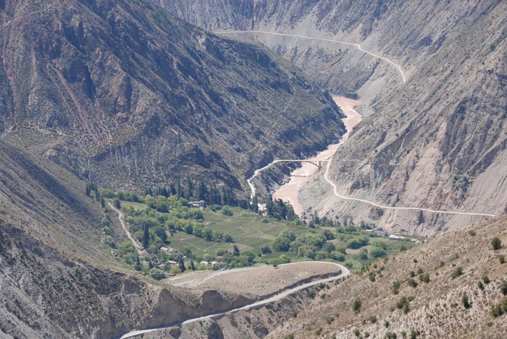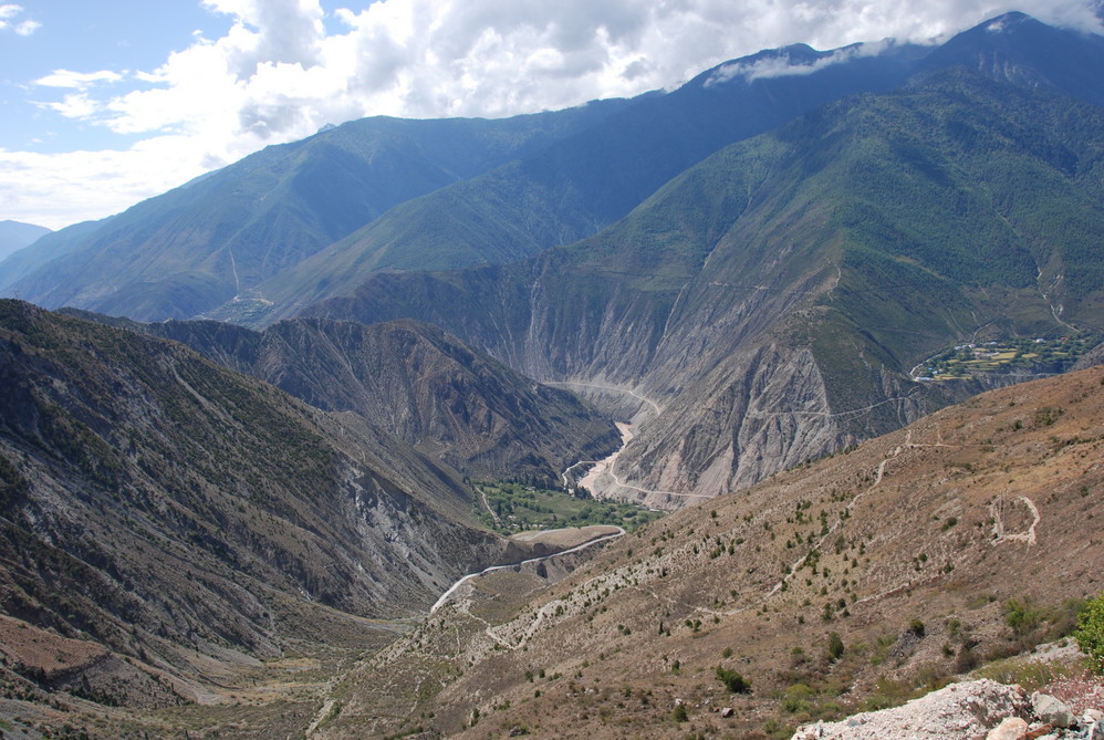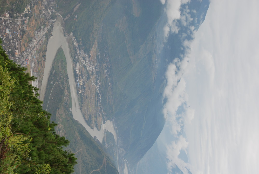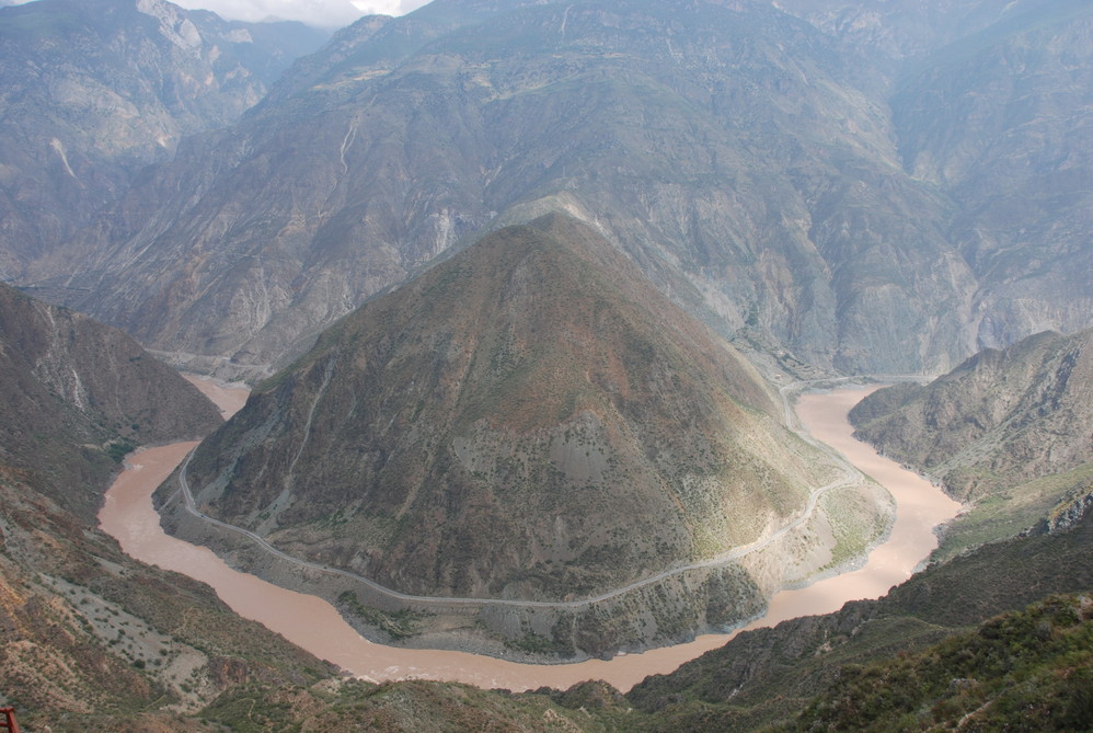告别三座圣山,一步一步远离最后的香格里拉 ,早从稻城 出发,经太阳谷 德荣,抵达茶马古道镇—奔子栏,在奔子栏观景台可以完整的看到金沙江 第一湾,金沙江 作为川滇两省的分界河,纵贯四川 得荣 县的定曲,在先后接纳纳马依河,硕曲河后,携三江 之水投入金沙江 ,江水汇合处形成“三壁夹两江”的景观,穿越峡谷的金沙江 水势更加浩荡,冲出川滇要塞之时,围绕金字塔般的日堆峰画了一个“几”字型大拐弯。
