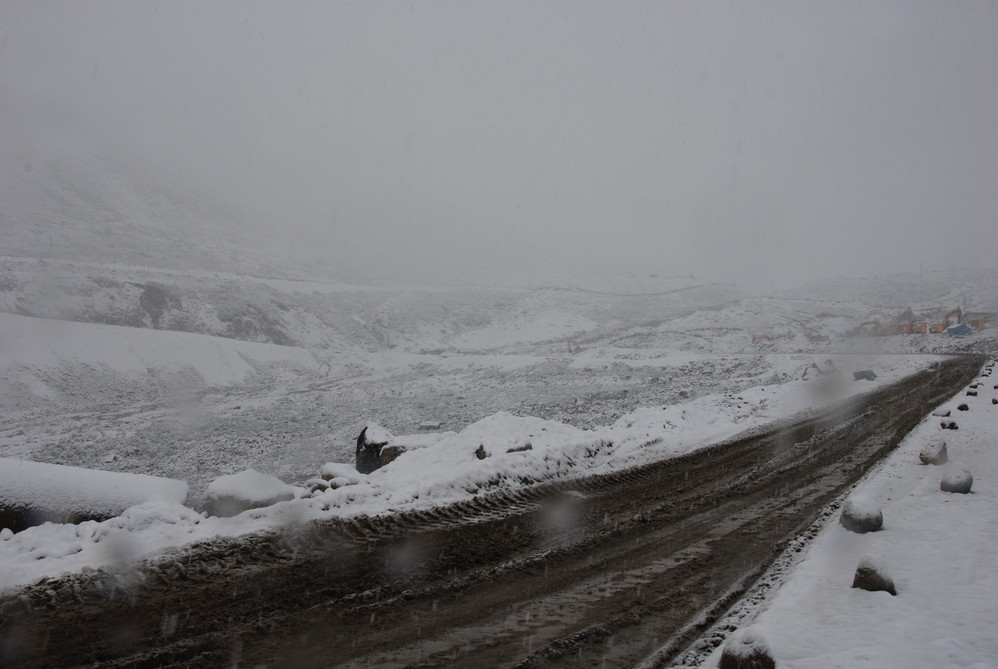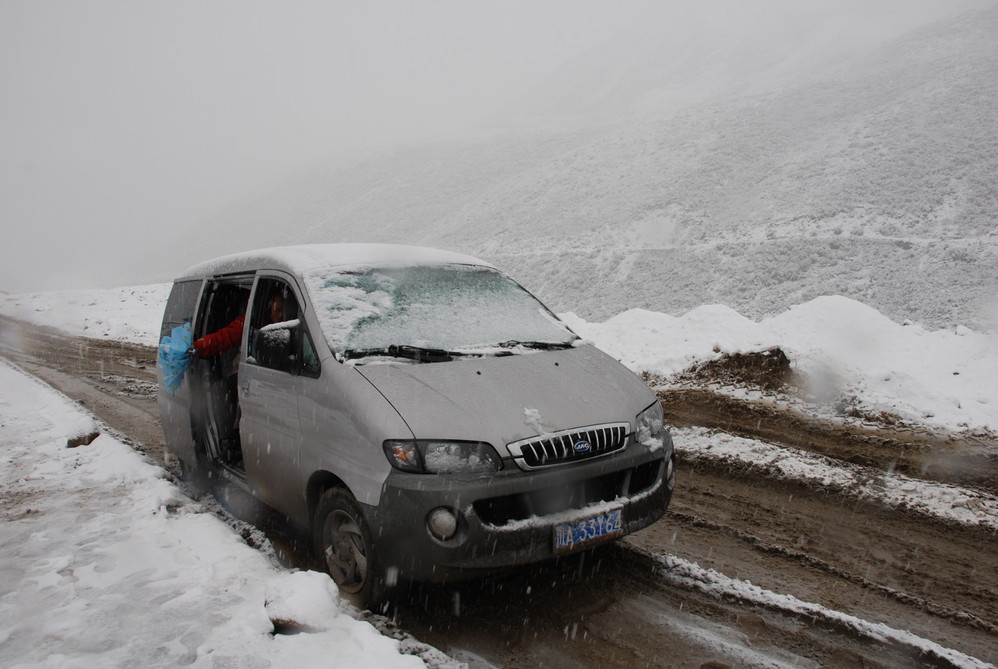 翻越折多山,大雪。我们车的备用胎螺栓被刮段了。备用胎放进车里面,幸好车比较宽。还比较舒服。