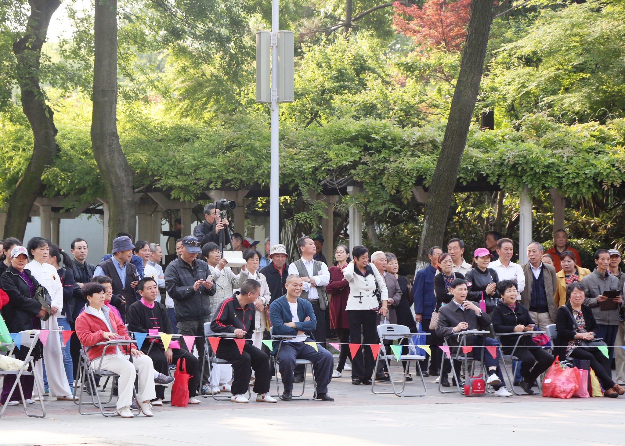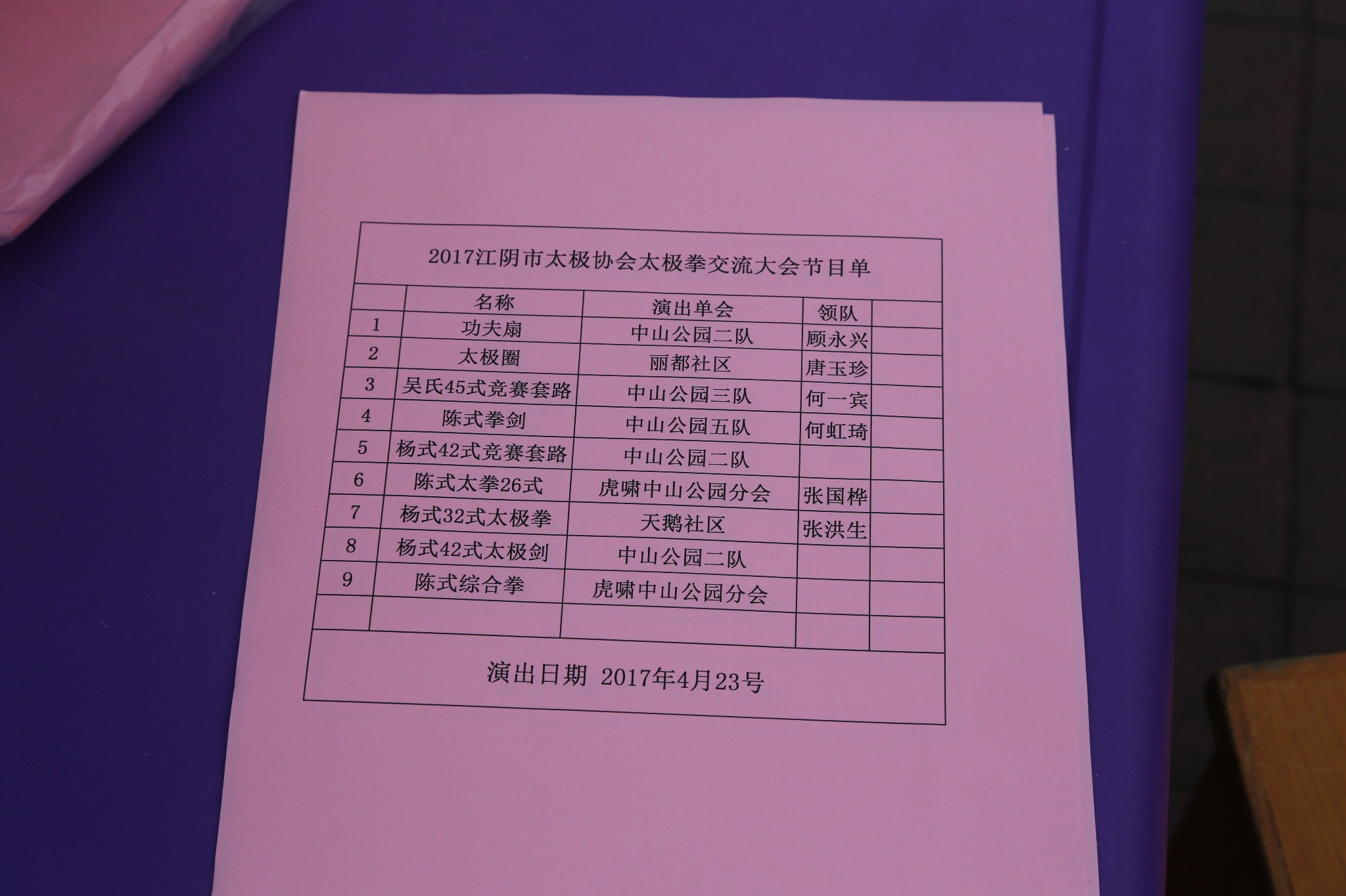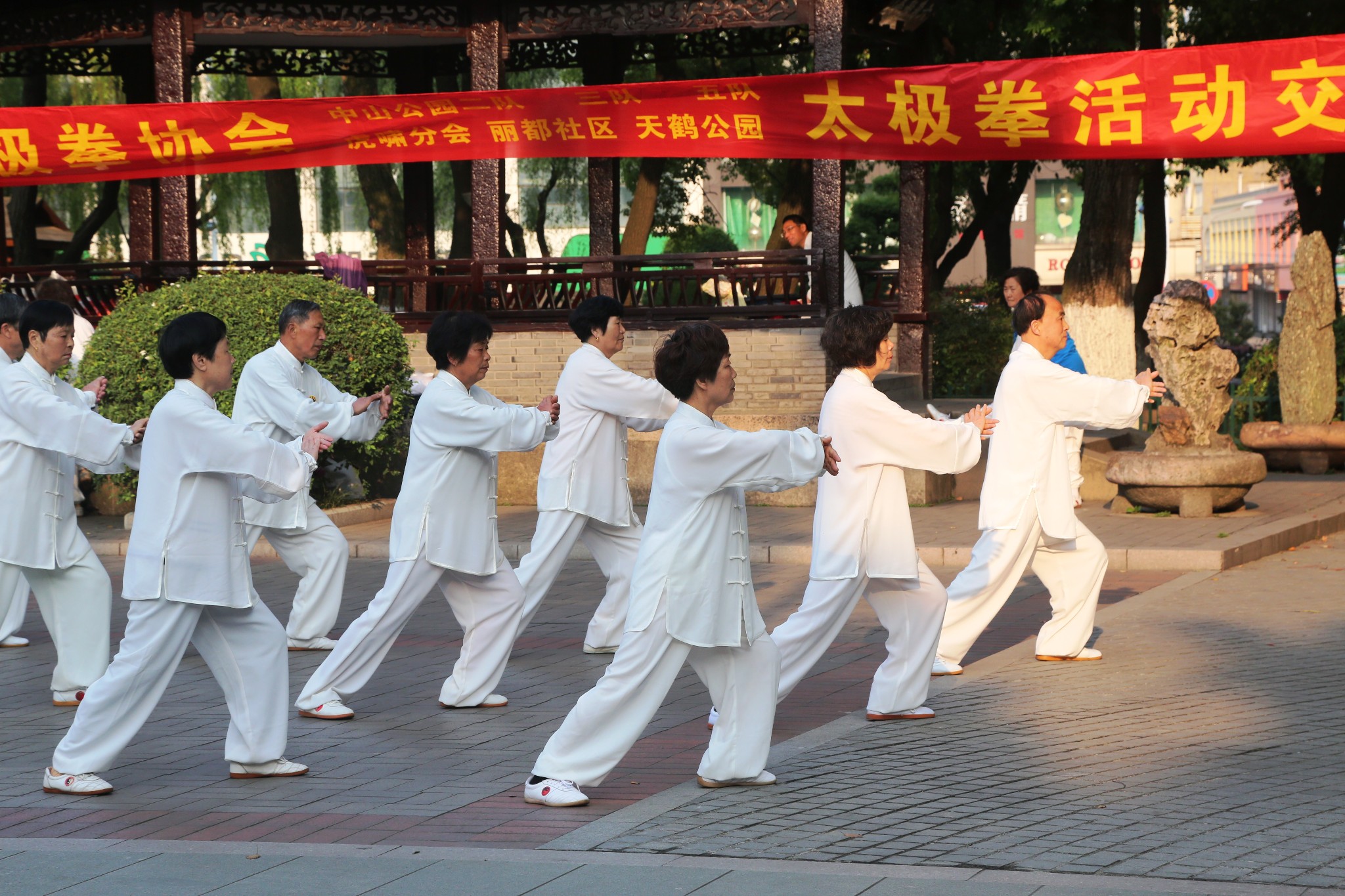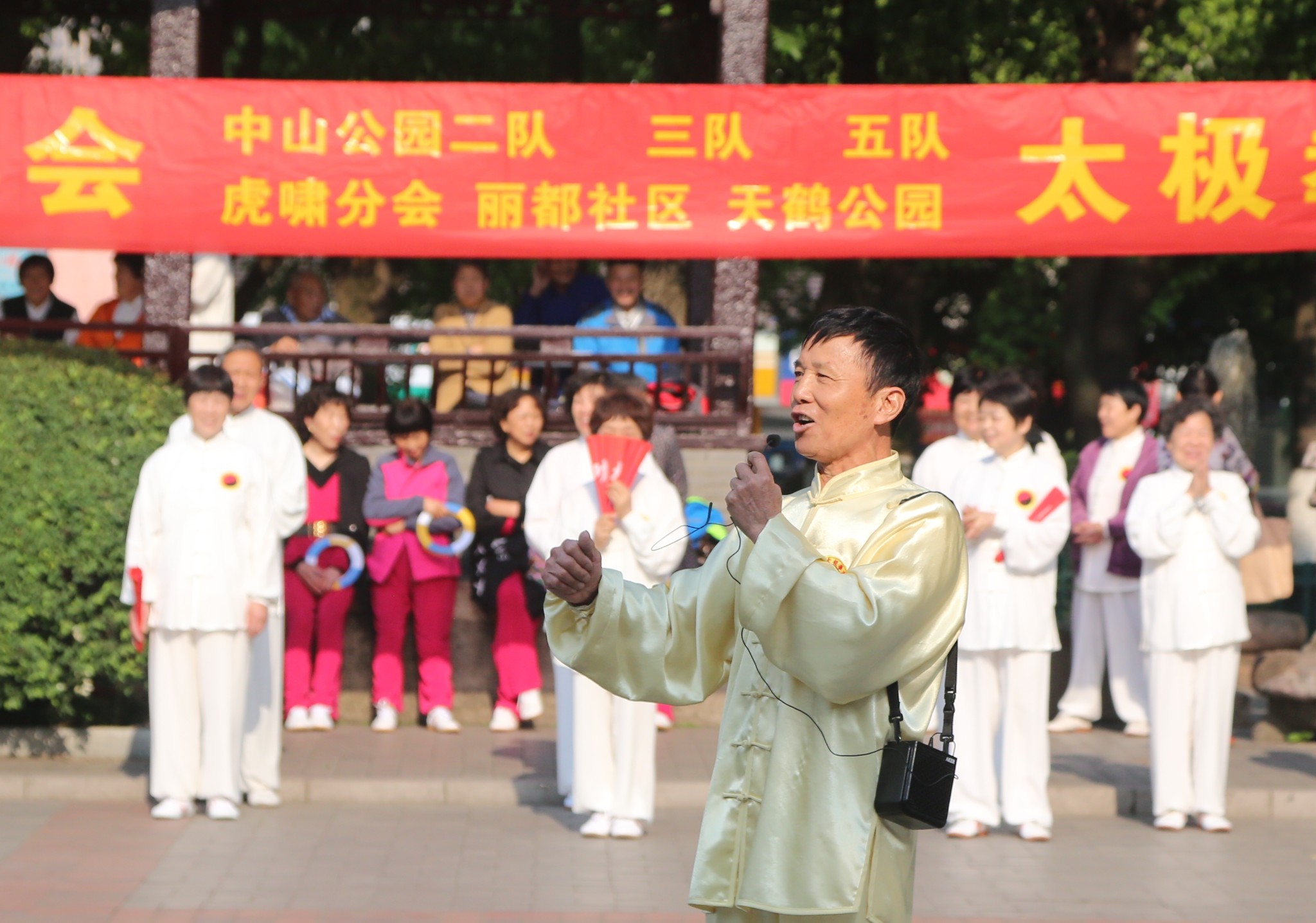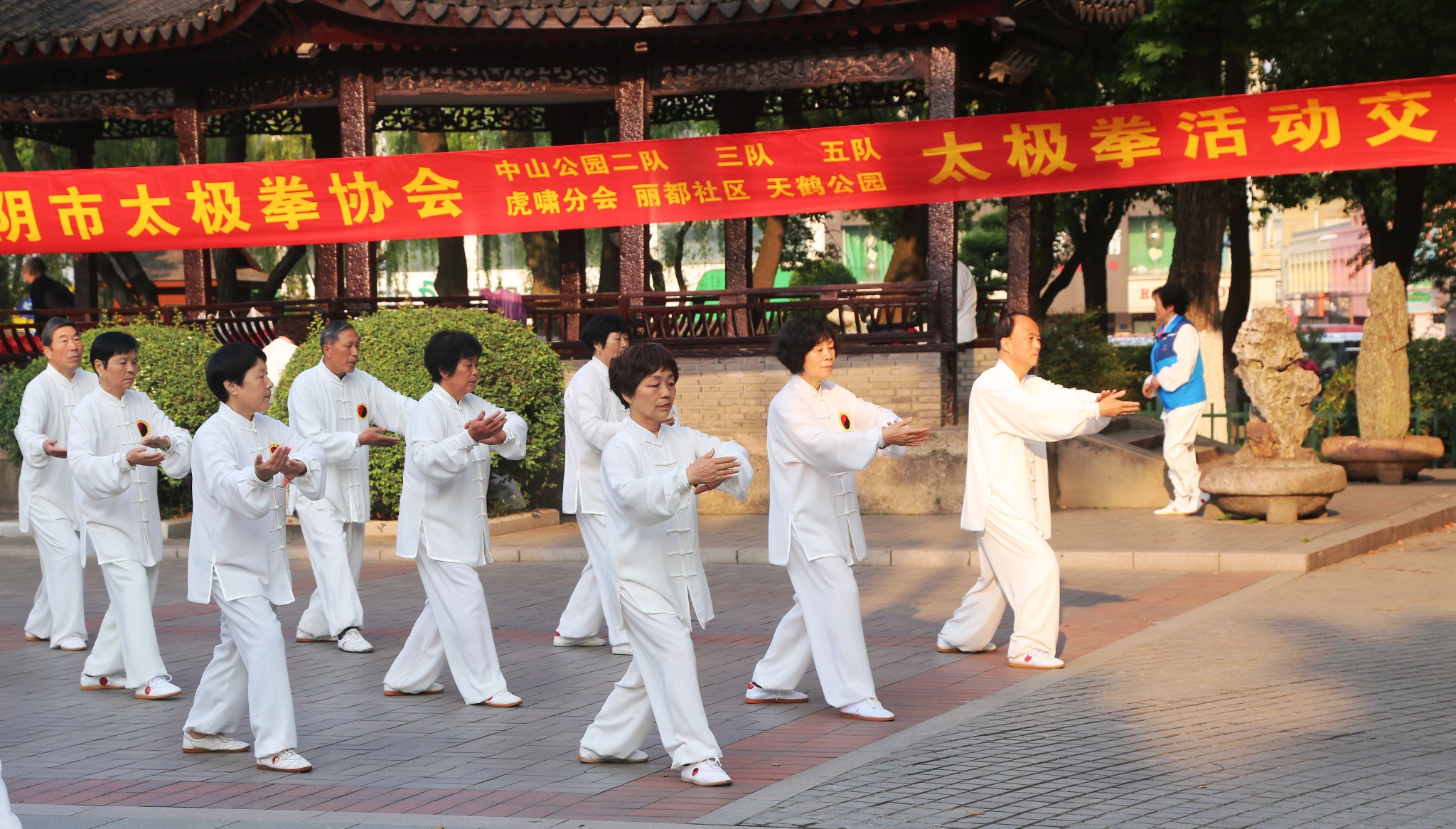 盛世华年,共享太极,今天,中山公园里的千年紫藤,枝繁叶茂,花香幽长。六角亭前,相聚各路太极箐英:他们是:丽都社区桃源居健康俱乐部代表队、中山公园三队、中山公园五队、虎啸中山公园分会、天鹤公园代表队、和本次活动的东道主:中山公园二队!这是今天活动的节目单: